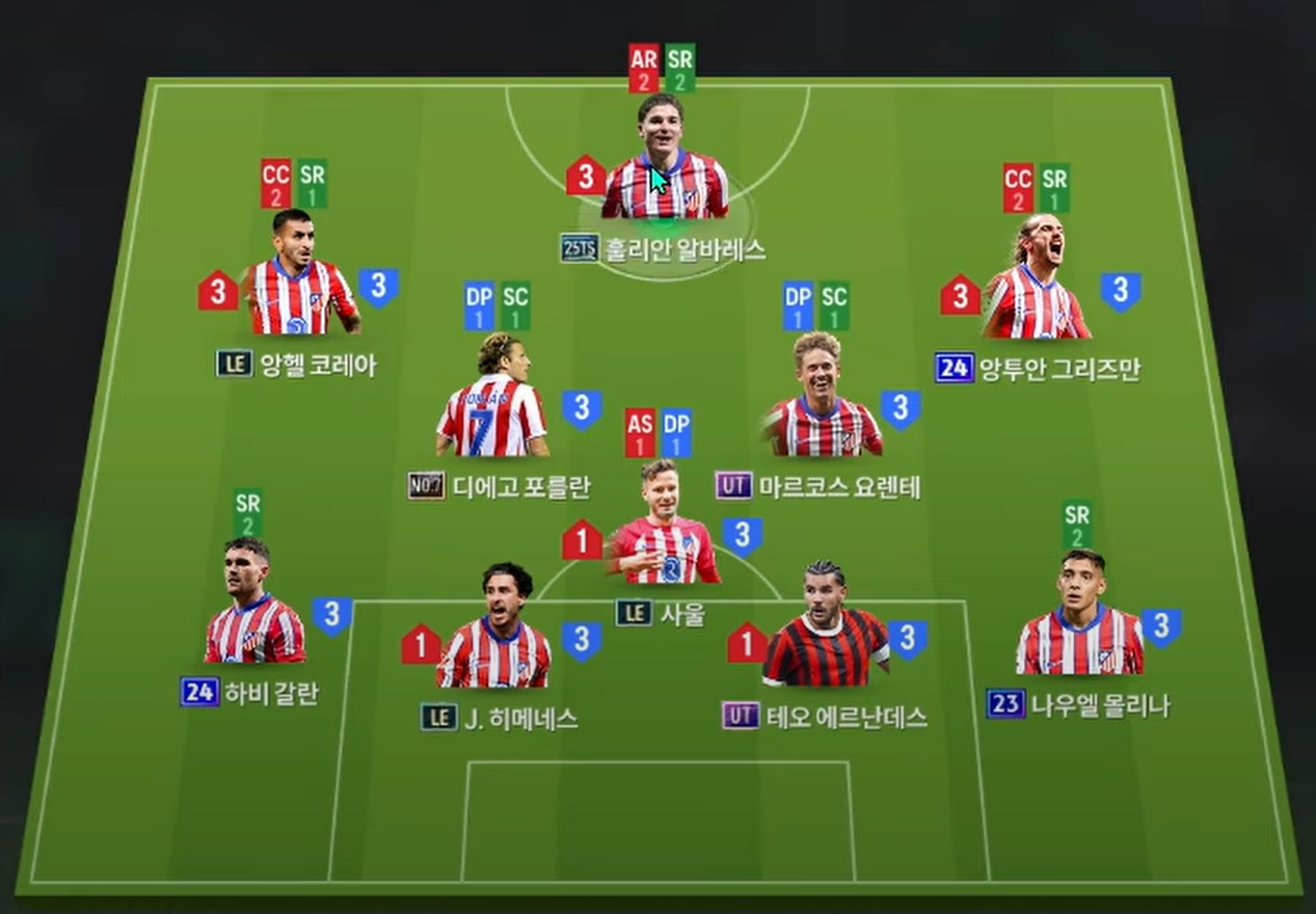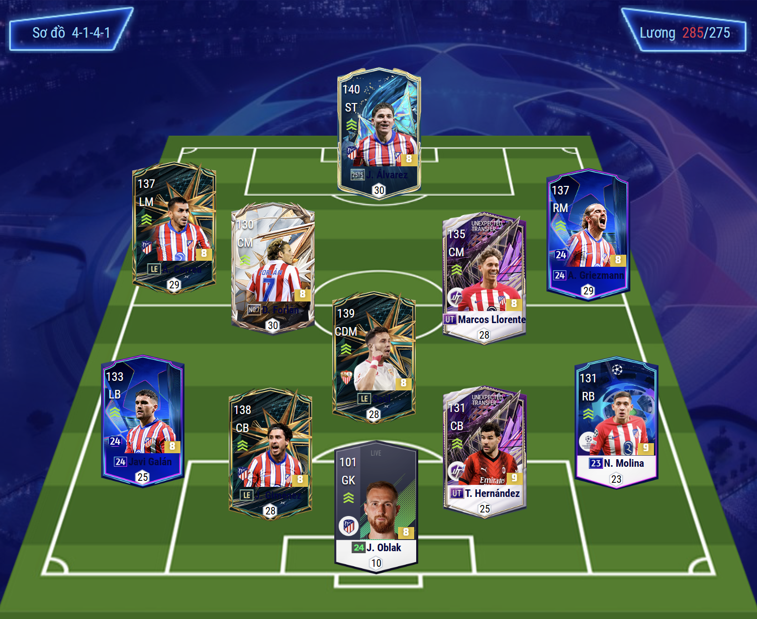 Sơ đồ 4141 được lựa chọn với Alvarez là cái tên chơi cao nhất trên hàng công cho vị trí tiền đạo cắm. Vị trí tiền vệ cánh phía sau là Correa và Griezmann, cả 2 đều sở hữu tốc độ tốt, khả năng leo biên ấn tượng cùng AI xâm nhập vòng cấm hay.