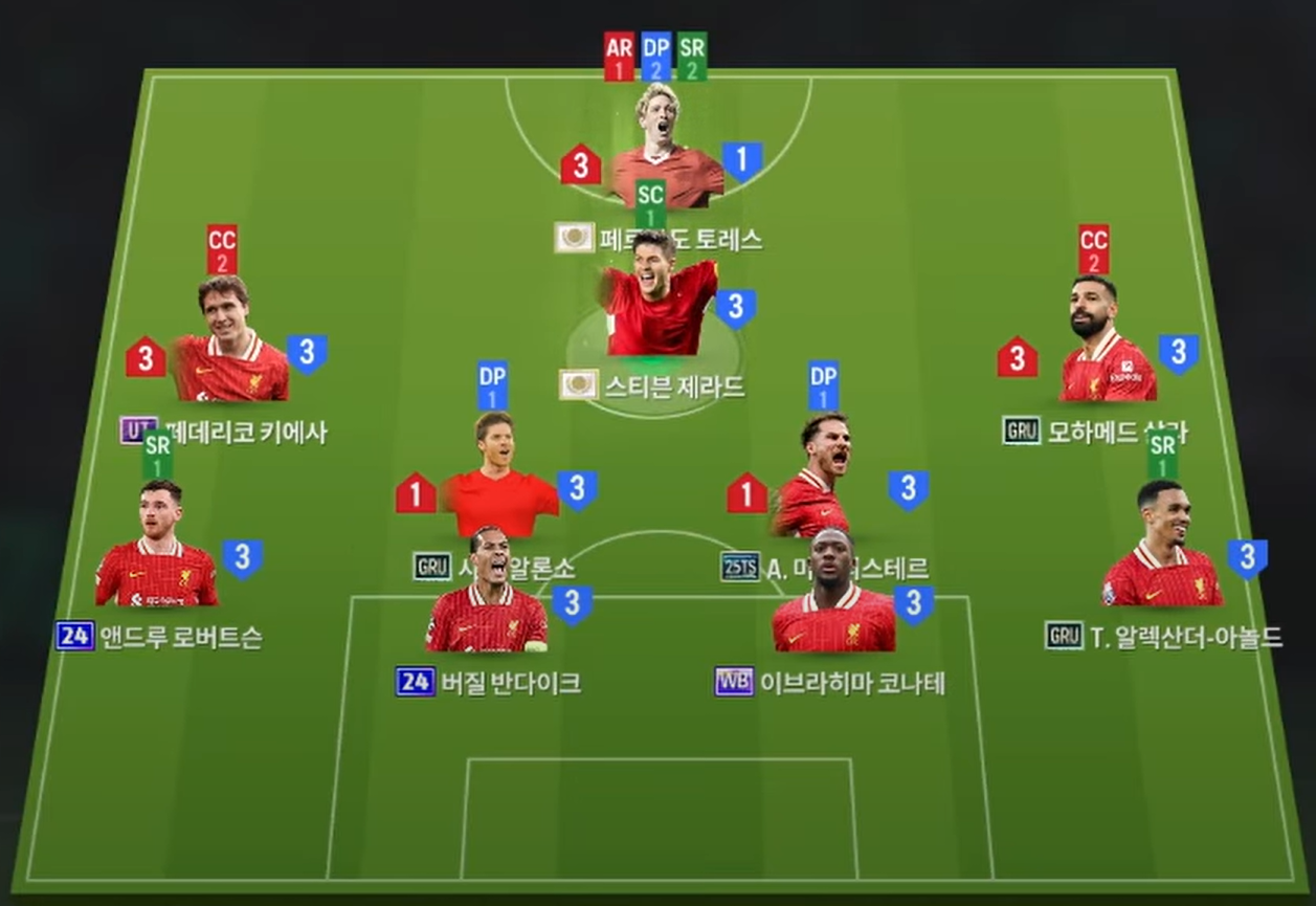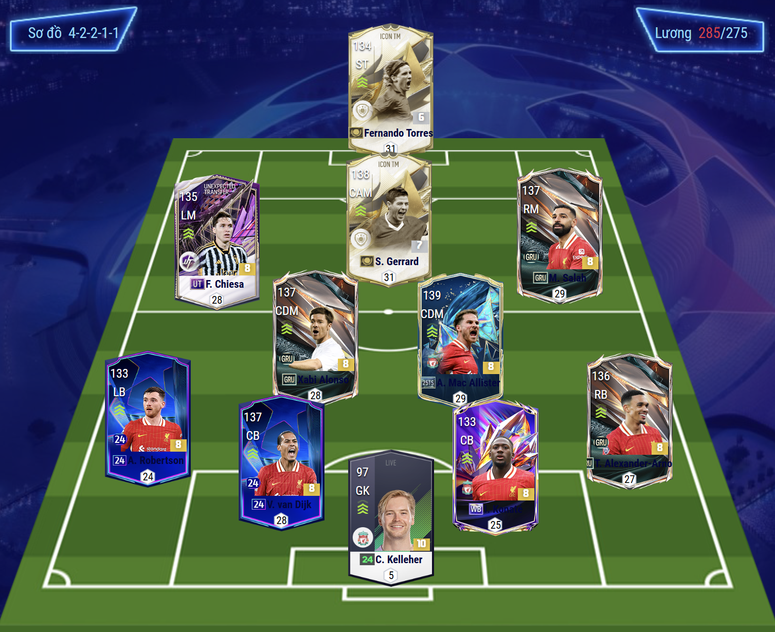 Sơ đồ 42211 được lựa chọn với vị trí tiền đạo cắm là Fernando Torres, sát thủ thực sự trên hàng công của Liverpool thời điểm đó. Hỗ trợ ngay phía sau là Gerrard, tạo nên cặp song sát nổi tiếng 1 thời giai đoạn 2007-2011. Cặp tiền vệ cánh được tin dùng với Chiesa và Salah vừa sở hữu tốc độ ấn tượng vừa cho khả năng chuyền tạt xuất sắc.