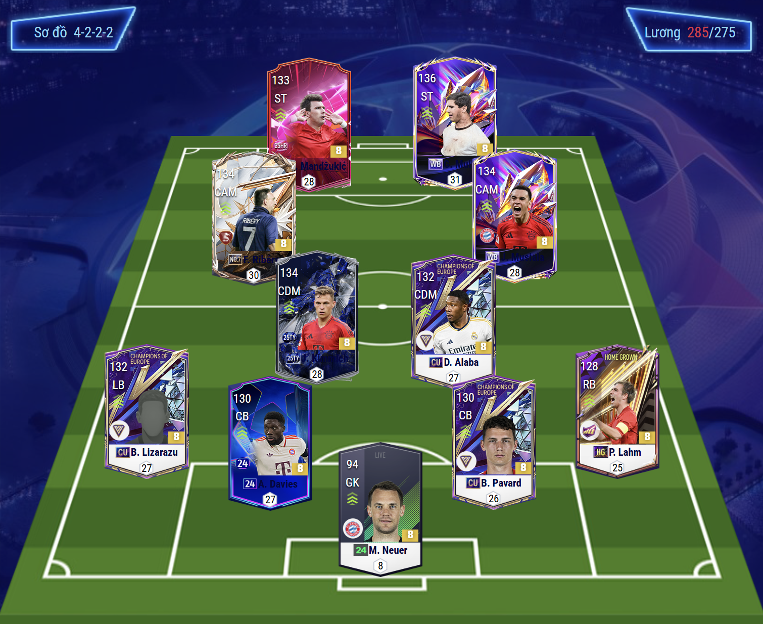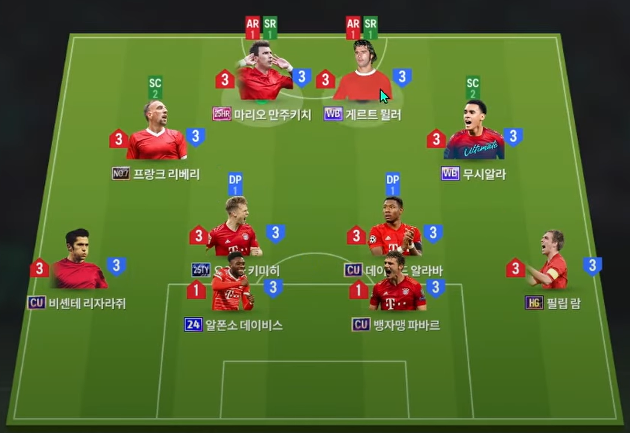Sơ đồ 4222 được lựa chọn sẽ là dạng sơ đồ 4222 LAM/RAM. Trong đó cặp tiền đạo cắm được lựa chọn là Mandzukic và Gerd Muller, cả 2 đều là tay săn bàn chất lượng cùng khả năng không chiến tốt tạo nên được hiệu quả săn bàn đa dạng. Cặp tiền vệ tấn công LAM, RAM lần lượt là Ribery và Musiala, cả 2 đều là những cầu thủ sở hữu tốc độ, khả năng rê dắt bóng tốt, chuyền bóng và sút xa cũng đều ấn tượng.