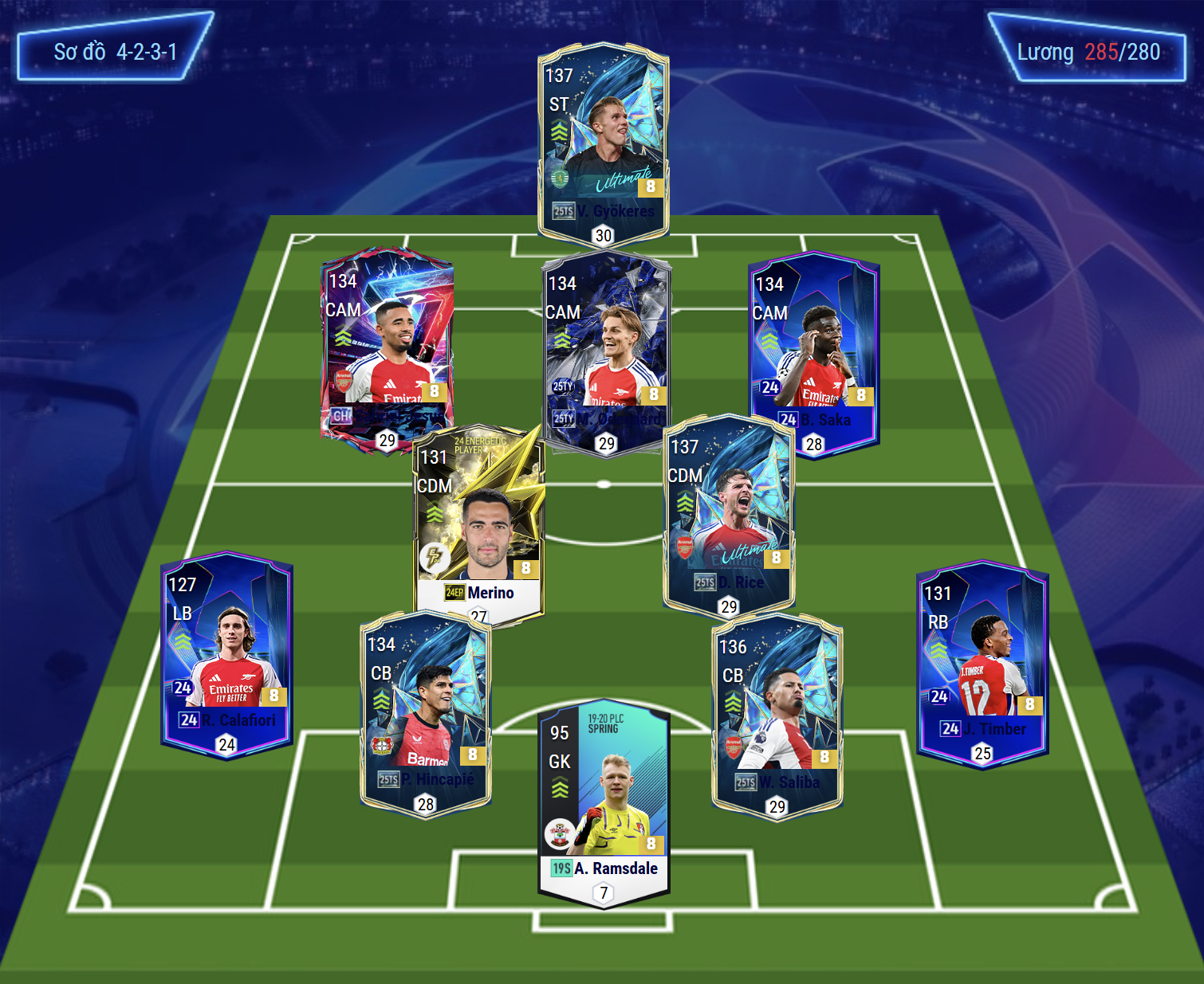 Sơ đồ 4231 được lựa chọn với vị trí tiền đạo cắm là Gyokeres, một trong những tiền đạo có kỹ năng dứt điểm tốt, thể hình ấn tượng và được kì vọng rất lớn tại Arsenal hiện tại. Hỗ trợ phía sau là 3 cái tên Jesus, Odegaard và Saka. Cả 3 đều là những cái tên sở hữu tốc độ ổn, khả năng di chuyển chuyền tạt cho đến dứt điểm xâm nhập đều ở mức tốt phù hợp cho 3 vị trí LAM, CAM và RAM.