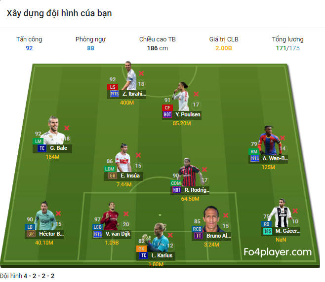 Đội hình này khá mạng ở tất cả các tuyến. Tiền đạo là sự góp mặt của Ibrahimovic và Poulsen. Trong khi đó 2 tiền vệ cánh được đặt cho 2 quái vật hành lang cánh Bale và Wan-Bissaka. 2 cầu thủ này đều có tốc độ cực tốt, thể hình ổn và khả năng lên xuống liên tục và hỗ trợ tấn công 2 bên hành lang cực kì hay.