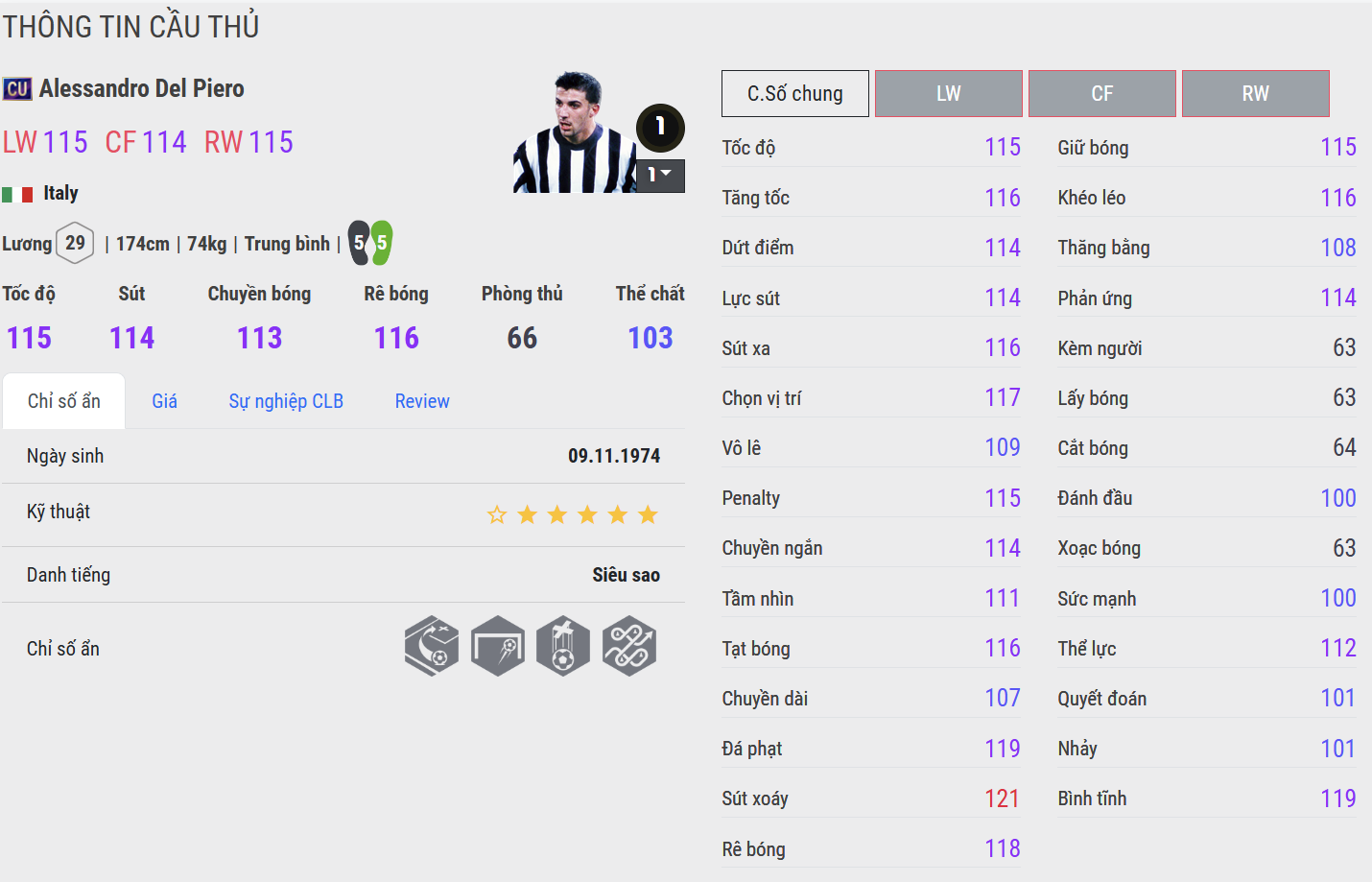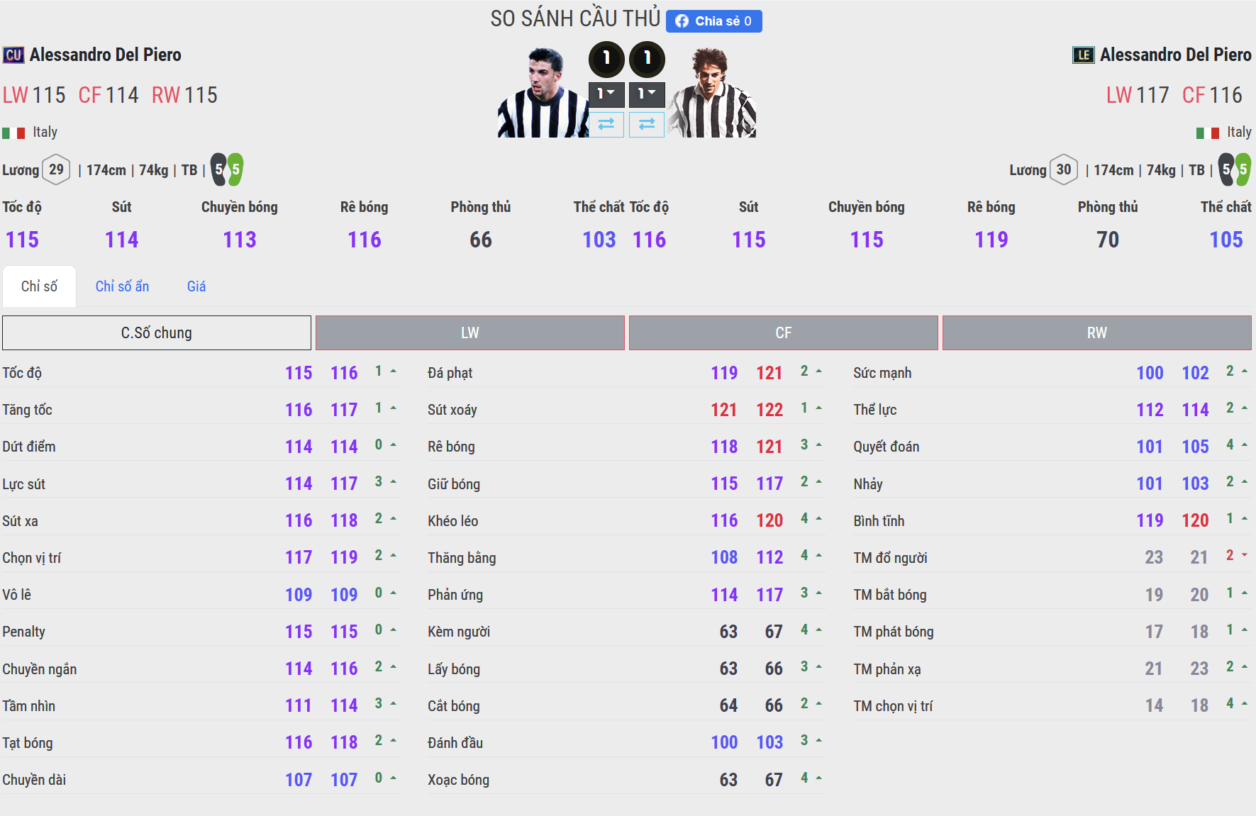 LE: Toàn diện hơn hẳn, lực sút mạnh hơn, chân không thuận ổn hơn và tỷ lệ thành bàn cao hơn trong nhiều tình huống. Đây là phiên bản khiến Del Piero trở thành mũi công chủ lực thực sự.