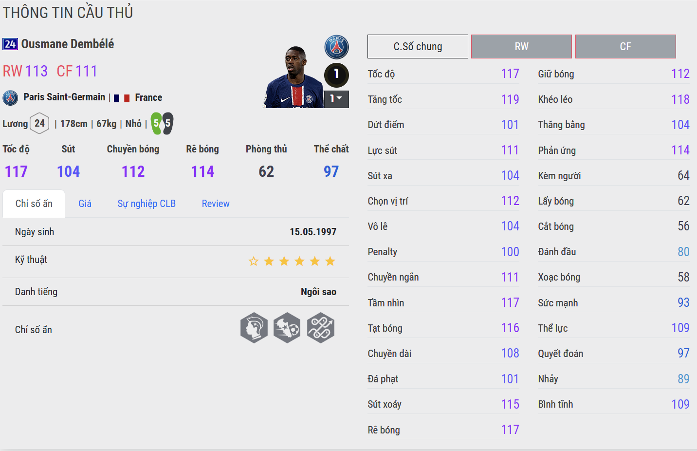 - WB: Đây là mùa mà Dembélé bứt tốc cực khét. Chỉ cần một khoảng trống nhỏ là anh có thể bỏ xa hậu vệ. Khả năng tăng tốc từ 0–100 gần như tức thì, rất khó để đối thủ kịp áp sát.