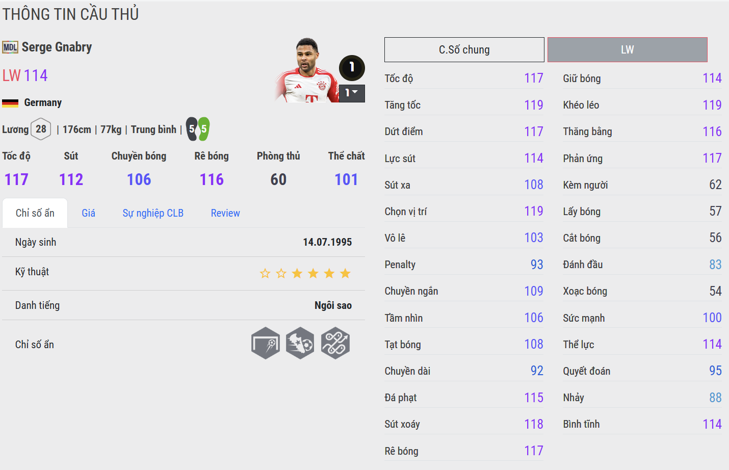 Gnabry MDL là mẫu cầu thủ tấn công biên mang thiên hướng bùng nổ. Anh sở hữu tốc độ tốt, khả năng xoay sở nhanh trong phạm vi hẹp cùng những cú dứt điểm quyết đoán. Trong gameplay, Gnabry thường xuyên gây khó khăn cho hàng thủ đối phương nhờ khả năng di chuyển linh hoạt và những cú sút xa chất lượng.