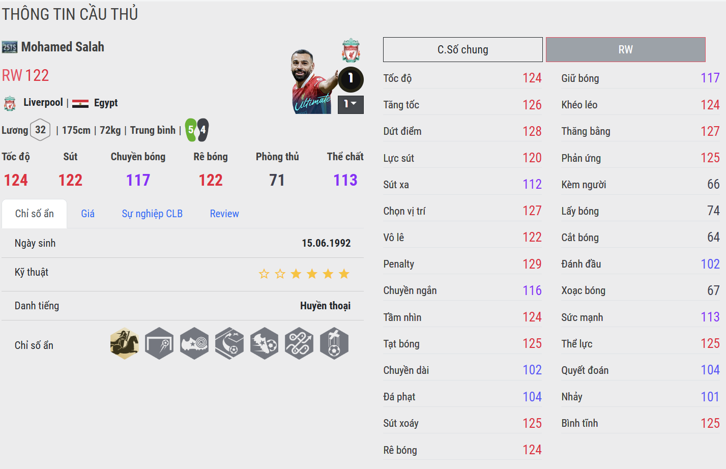 Salah 25TS là mũi công chủ lực bên hành lang phải với tốc độ xé gió và kỹ năng đi bóng sắc bén. Điểm mạnh nhất của anh là khả năng bó vào trong rồi tung ra cú sút ZD cực hiểm, trở thành “ác mộng” cho bất kỳ hàng thủ nào. Đây là lựa chọn hàng đầu cho những HLV thích phong cách tấn công trực diện.
