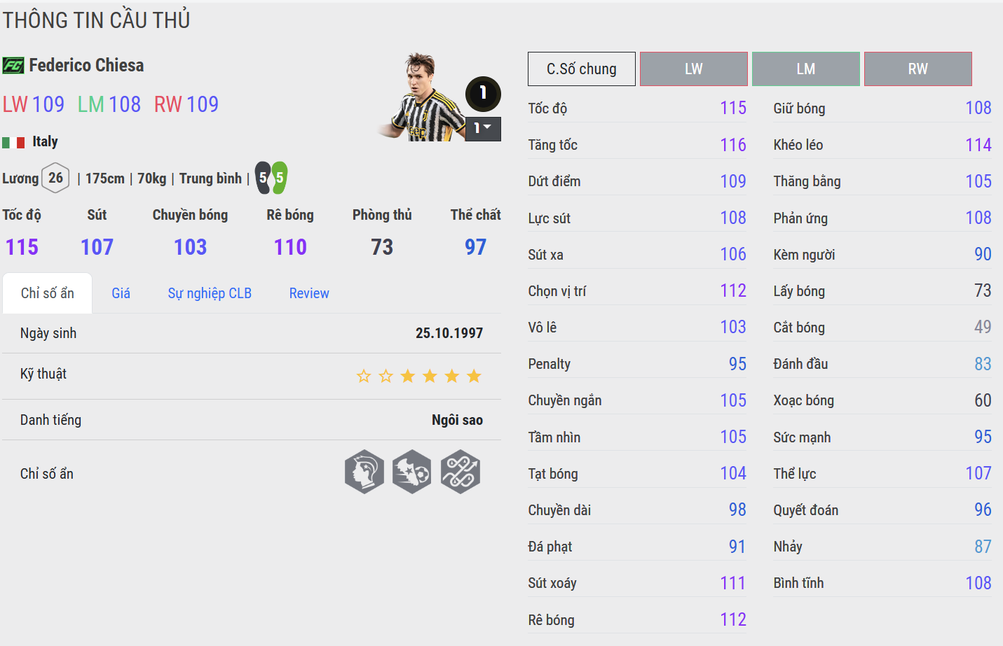 Chiesa FC đem đến sự năng động và máu lửa trong từng pha bóng. Anh nổi bật với khả năng bứt tốc, tì đè tốt so với thể hình và những pha xử lý táo bạo. Trong gameplay, Chiesa không chỉ giỏi ở những pha đột phá cá nhân mà còn rất tích cực hỗ trợ phòng ngự, mang lại sự cân bằng cho cánh phải.
