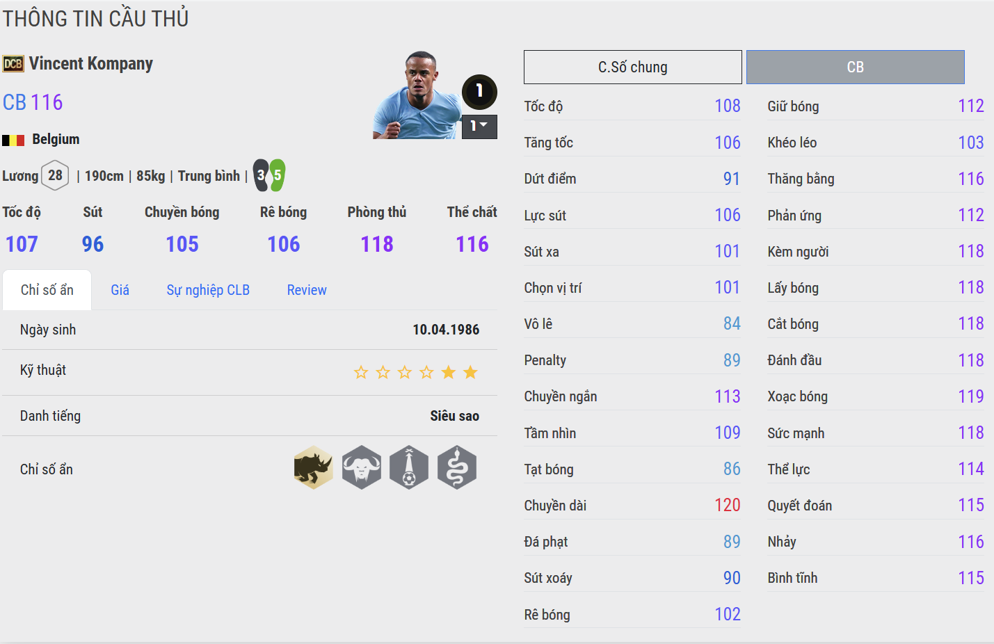 Kompany DCB là thủ lĩnh thực thụ. Anh vừa mạnh mẽ trong tranh chấp tay đôi, vừa sở hữu khả năng phán đoán tình huống xuất sắc. Ngoài ra, Kompany còn tham gia phát động tấn công nhờ kỹ năng chuyền bóng ổn định. Trong gameplay, đây là mẫu CB toàn diện, luôn giữ được sự tỉnh táo và truyền cảm hứng cho hàng thủ.