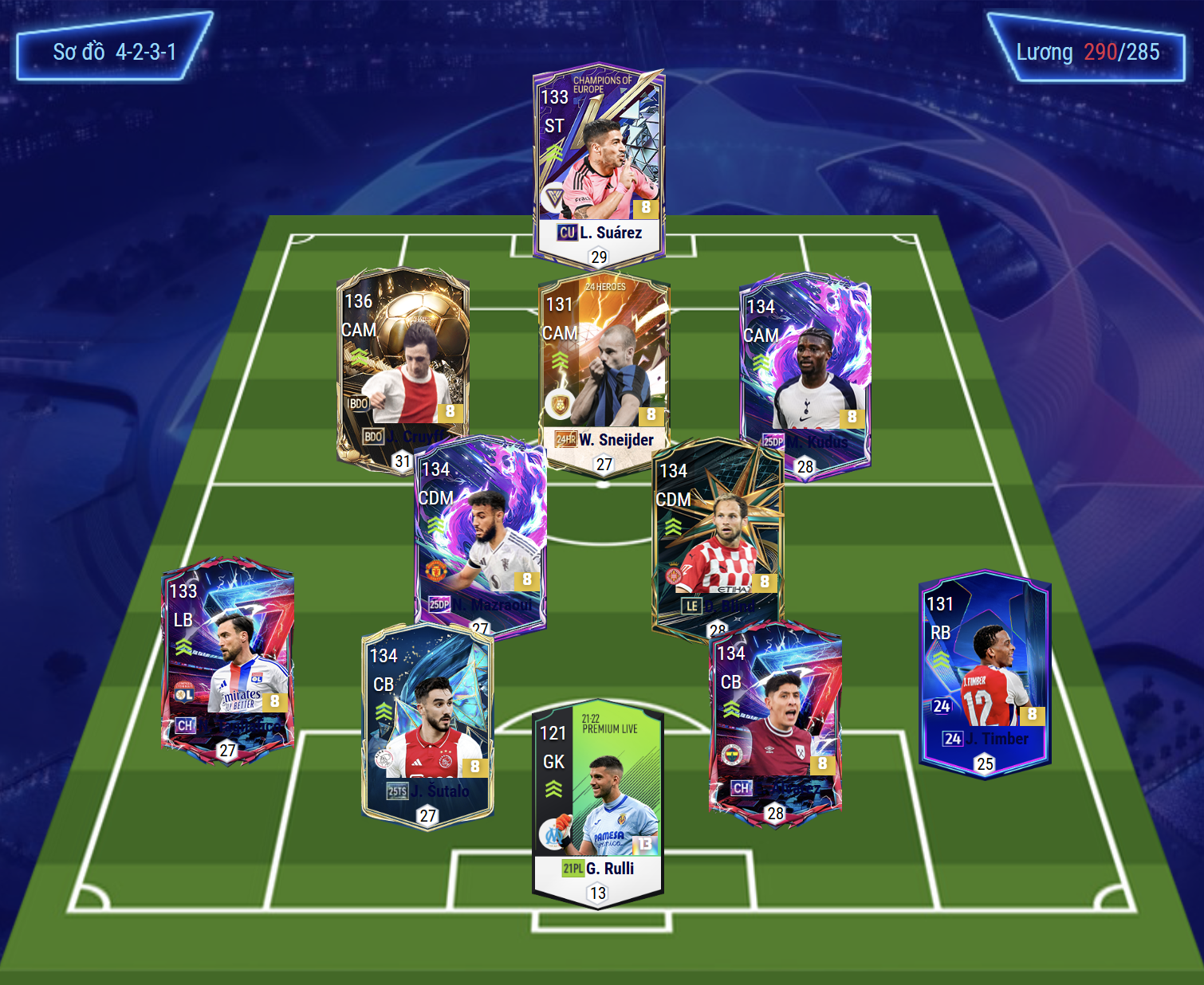 Sơ đồ được lựa chọn là sơ đồ 4231 với vị trí tiền đạo cắm là Suarez, cầu thủ người Uruguay sở hữu khả năng dứt điểm cực kì nhạy bén và hiệu quả., AI di chuyển khôn cùng khả năng chuyền bóng tốt. Bộ 3 tiền vệ tấn công Cruyff, Sneijder và Kudus lần lượt cho 3 vị trí LAM, CAM và RAM trong đó Cruyff và Kudus sẽ có xu hướng chơi bám biên nhiều hơn trong khi vị trí tiền vệ trung tâm Sneijder cũng đem lại hiệu quả từ những pha dứt điểm tuyến 2.