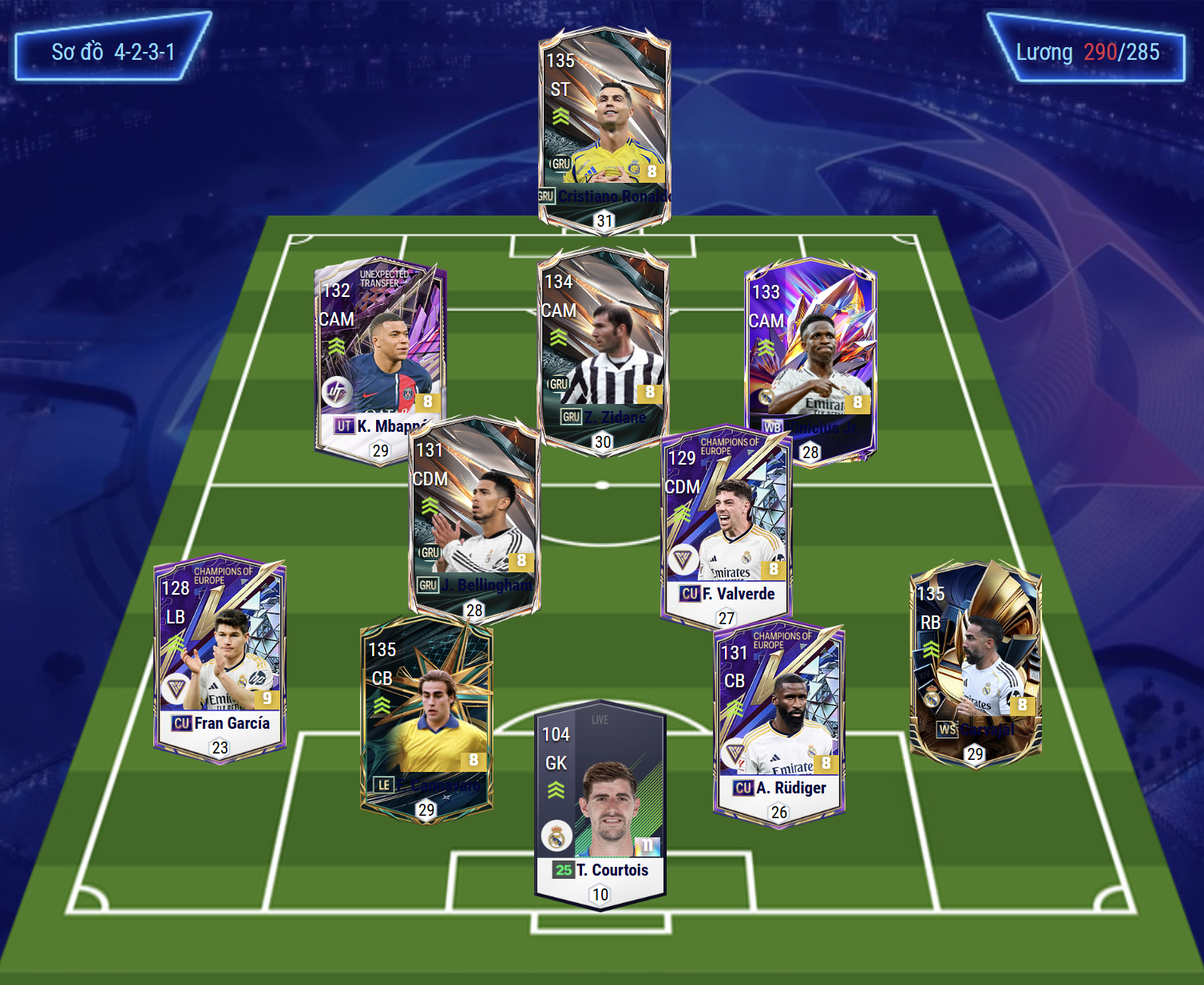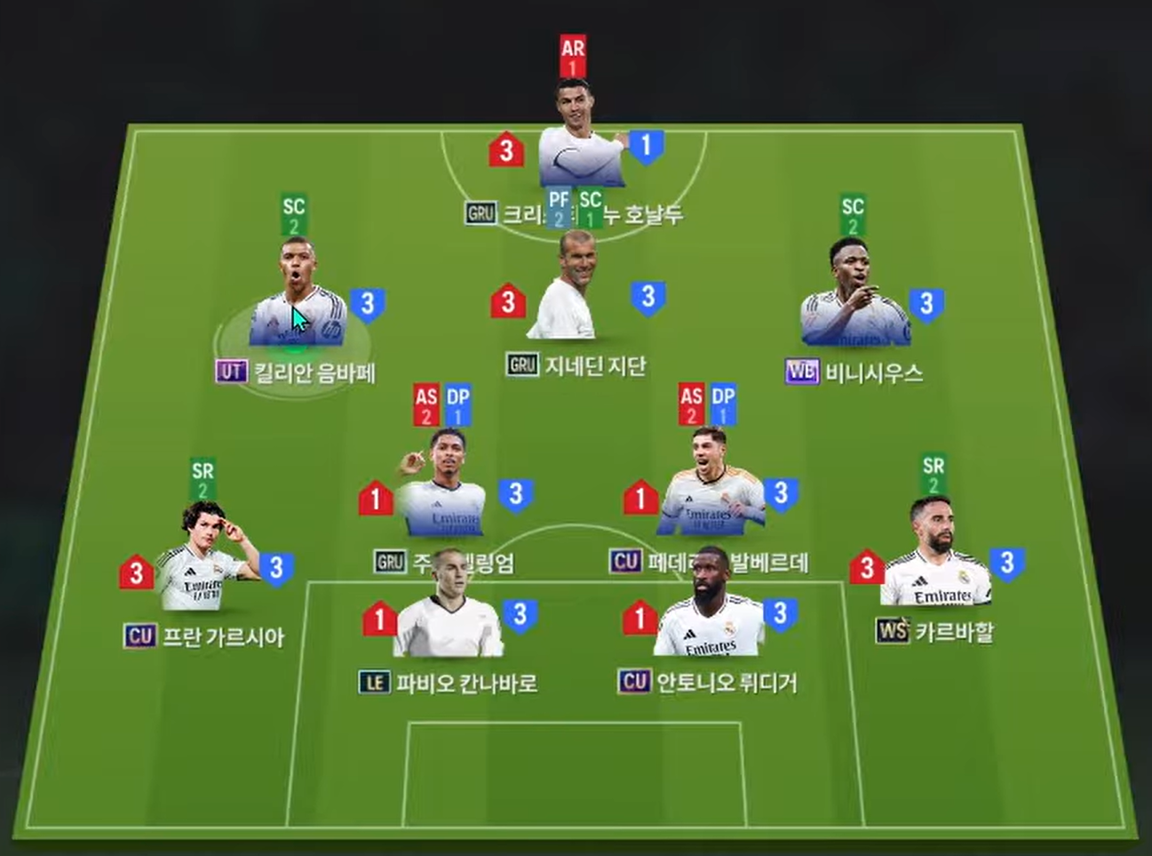 Sơ đồ được lựa chọn cho team color Real là sơ đồ 4231, trong đó đầu tàu là Cristiano Ronaldo, cầu thủ người Bồ sở hữu khả năng dứt điểm toàn diện, bộ kỹ năng xử lý bóng, không chiến cho tới rê dắt đều rất ấn tượng. Hỗ trợ phía sau là bộ 3 tiền vệ công Mbappe, Zidane và Vinicius trong đó Mbappe và Vinicius sẽ có xu hướng bám cánh nhiều hơn trong khi Zidane sẽ thi đấu như một hộ công vừa hỗ trợ tấn công tốt vừa sẵn sàng xâm nhập ghi bàn khi cần.