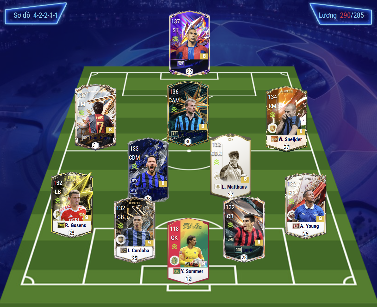 Bộ tứ vệ với Gosen và Young thi đấu ở 2 biên sở hữu tốc độ, khả năng phòng ngự cực kì nổi bật, cùng với đó kỹ năng hỗ trợ tấn công của cặp đôi này cũng tạo nên hiệu quả ở mức ổn. Cặp trung vệ Cordoba và Lucio là những cái tên phù hợp meta sở hữu tốc độ và AI phòng ngự cực kì tốt, khả năng tranh chấp, cắt bóng của bộ đôi này cũng đem lại hiệu quả ấn tượng. Thủ môn Sommer là cái tên được tin dùng trong khung gỗ.