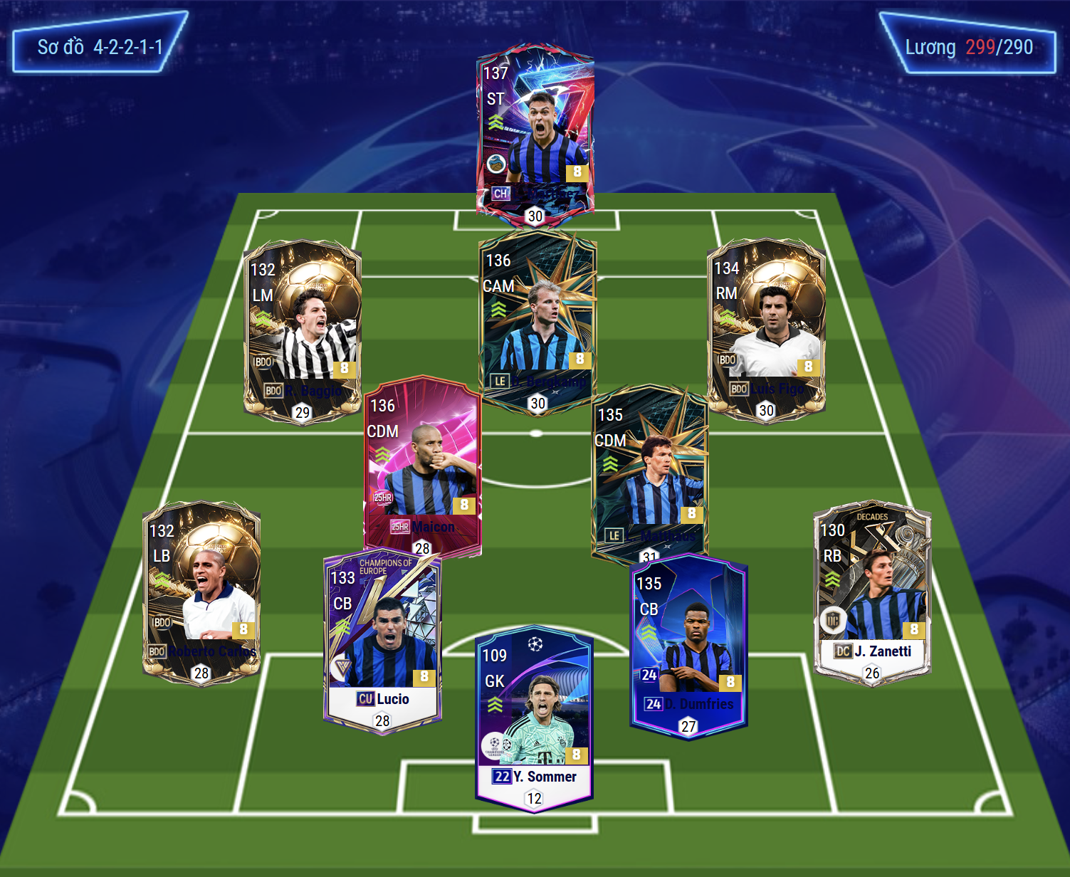 Sơ đồ chiến thuật được lựa chọn cho Inter Milan là sơ đồ 42211 hiện đang cực kì phù hợp với meta hiện tại. Tiền đạo cắm được lựa chọn là Lautaro Martinez, một mẫu tiền đạo sở hữu tốc độ, khả năng dứt điểm chính xác bằng cả 2 chân cùng bộ kỹ năng xử lý bóng rất ổn. Hỗ trợ phía sau là Bergkamp, một trong những tiền vệ công được đánh giá rất cao ở những meta gần đầy bởi khả năng dứt điểm xuất sắc, kỹ năng chuyền bóng cho tới AI di chuyển xâm nhập cực kì nổi bật.