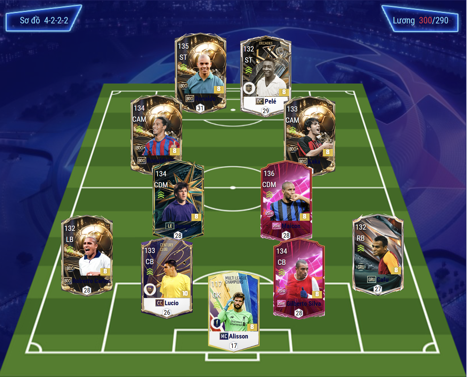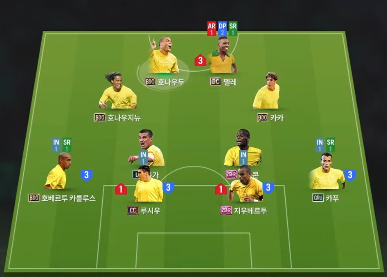 Sơ đồ 4222 được lựa chọn cho team color Brazil với bộ đôi tiền đạo cắm Ronaldo de lima và Pele. Cặp tiền đạo này sở hữu tốc độ, khả năng rê dắt xử lý bóng ấn tượng cùng bộ kỹ năng dứt điểm toàn diện bằng cả 2 chân. Hỗ trợ phía sau là bộ đôi tiền vệ tấn công Ronaldinho và Kaka cho 2 vị trí LAM và RAM. Cả 2 đều sở hữu tốc độ, khả năng dứt điểm chuyền bóng phối hợp cho đến rê dắt cực kì hiệu quả.