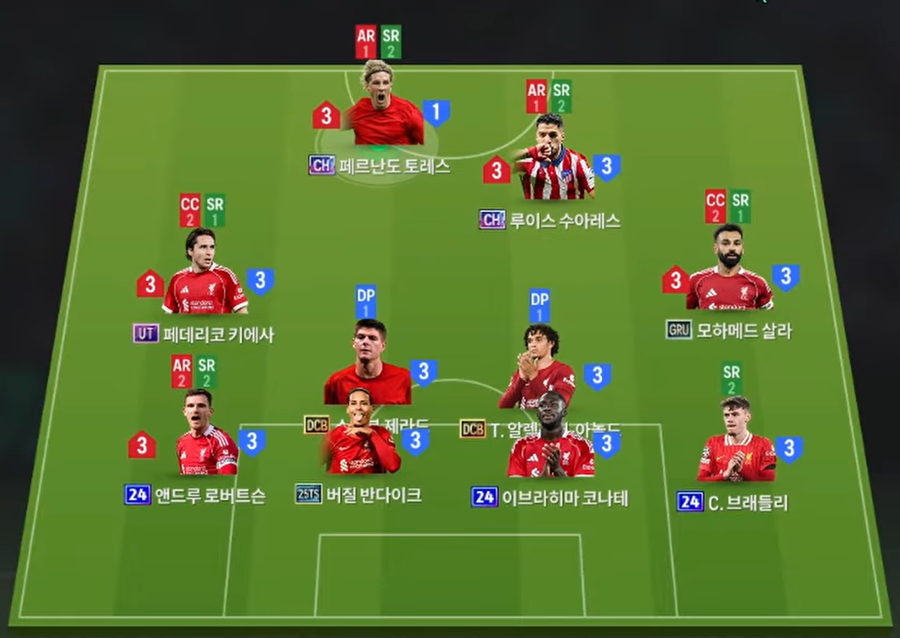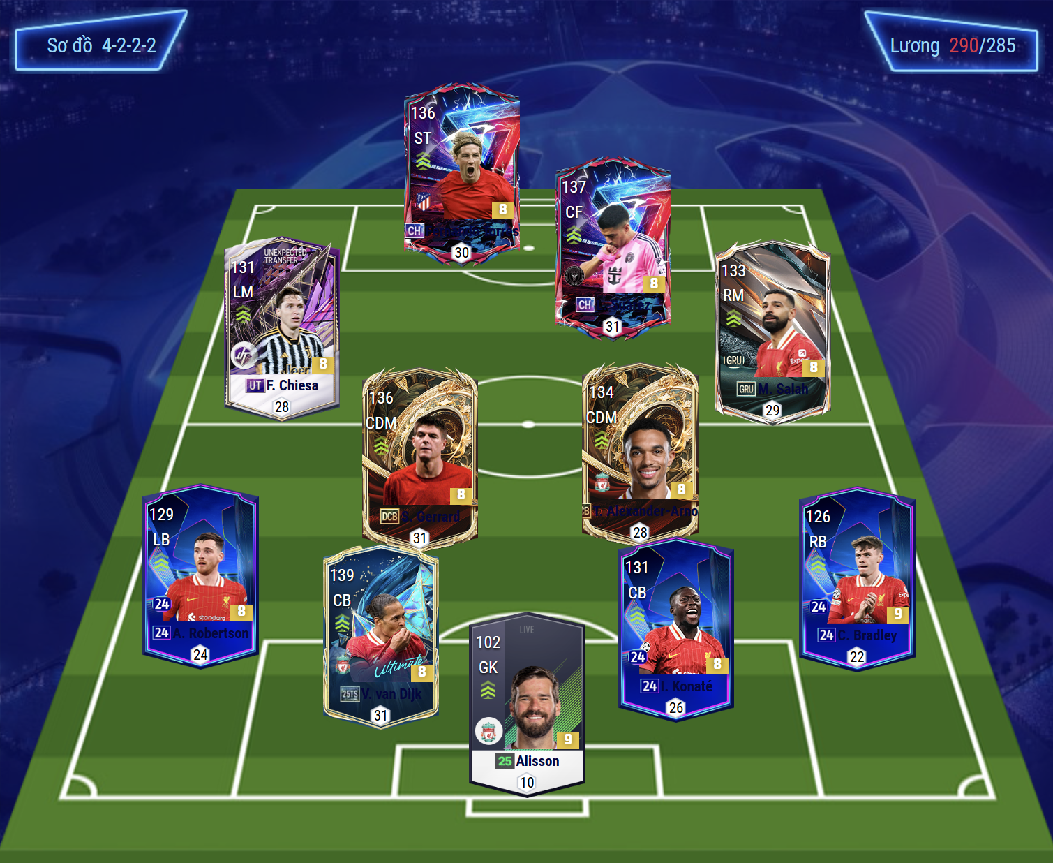 Sơ đồ được lựa chọn là sơ đồ 4222 với cặp tiền đạo sát thủ Torres và Suarez. Cả 2 đều sở hữu AI di chuyển thông minh cùng khả năng dứt điểm xuất sắc bằng cả 2 chân, bộ kỹ năng xử lý bóng ở mức ổn, kỹ năng không chiến ở mức đủ dùng. Cặp tiền vệ cánh Chiesa và Salah sở hữu tốc độ, khả năng chuyền bóng, rê dắt cho tới khả năng xâm nhập 2 biên đều ấn tượng.