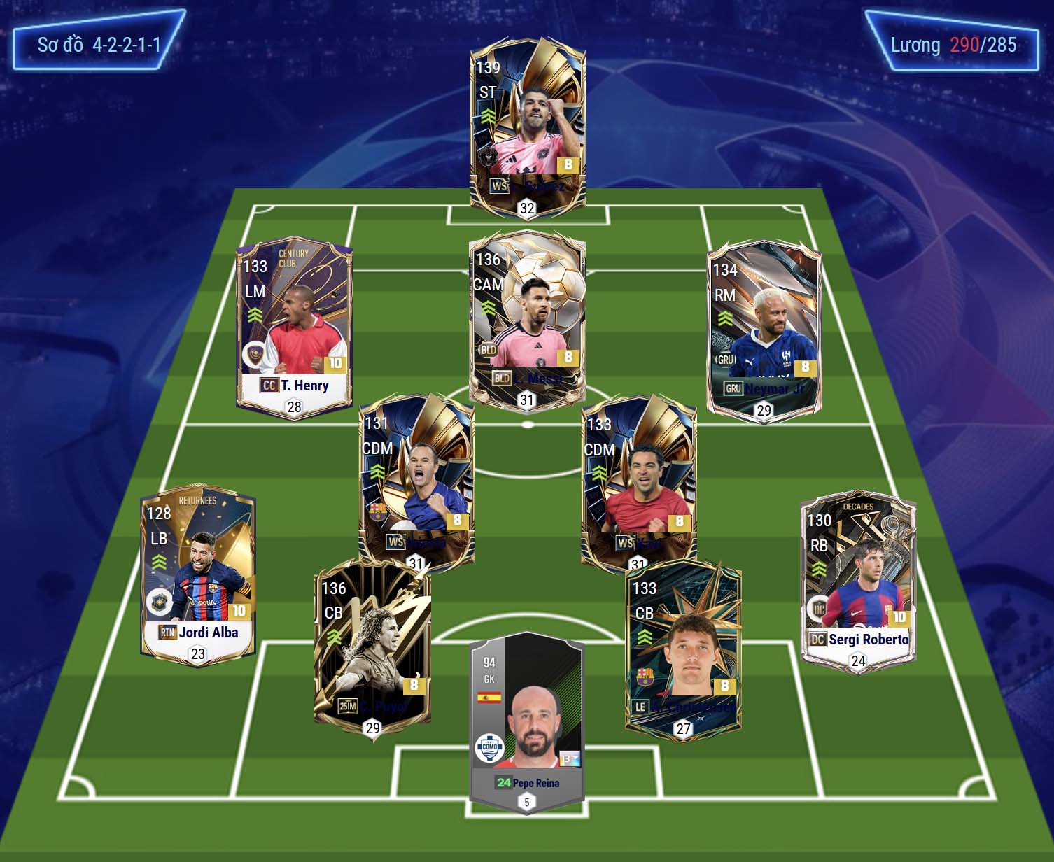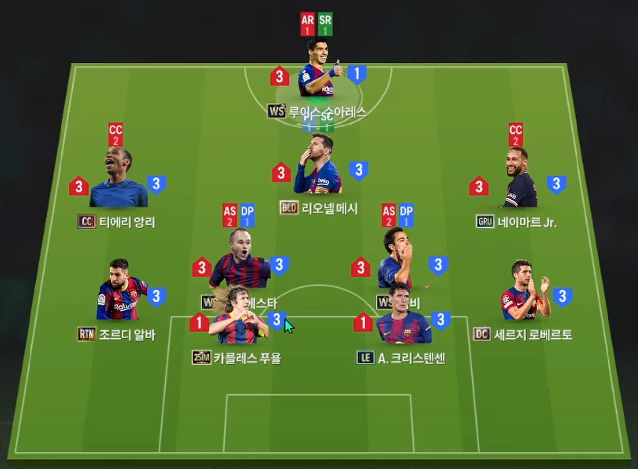 Sơ đồ 42211 được lựa chọn với vị trí tiền đạo cắm là Suarez, cầu thủ người Uruguay sở hữu khả năng săn bàn thượng hạng, AI di chuyển thông minh để kéo người cũng như tạo ra khoảng trống để dứt điểm. Hỗ trợ phía sau là tiền vệ công Messi, huyền thoại của Barca cho thấy khả năng làm bóng phối hợp tốt, xử lý bóng cực kì dẻo và những cú cứa lòng ảo ma từ ngoài vòng cấm có thể đánh bại mọi thủ môn. Neymar và Henry sẽ thi đấu ở 2 bên hành lang cánh sở hữu tốc độ cũng khả năng rê dắt nổi bật, AI xâm nhập biên tốt sẽ giúp tối ưu hóa khả năng tấn công trong sơ đồ.