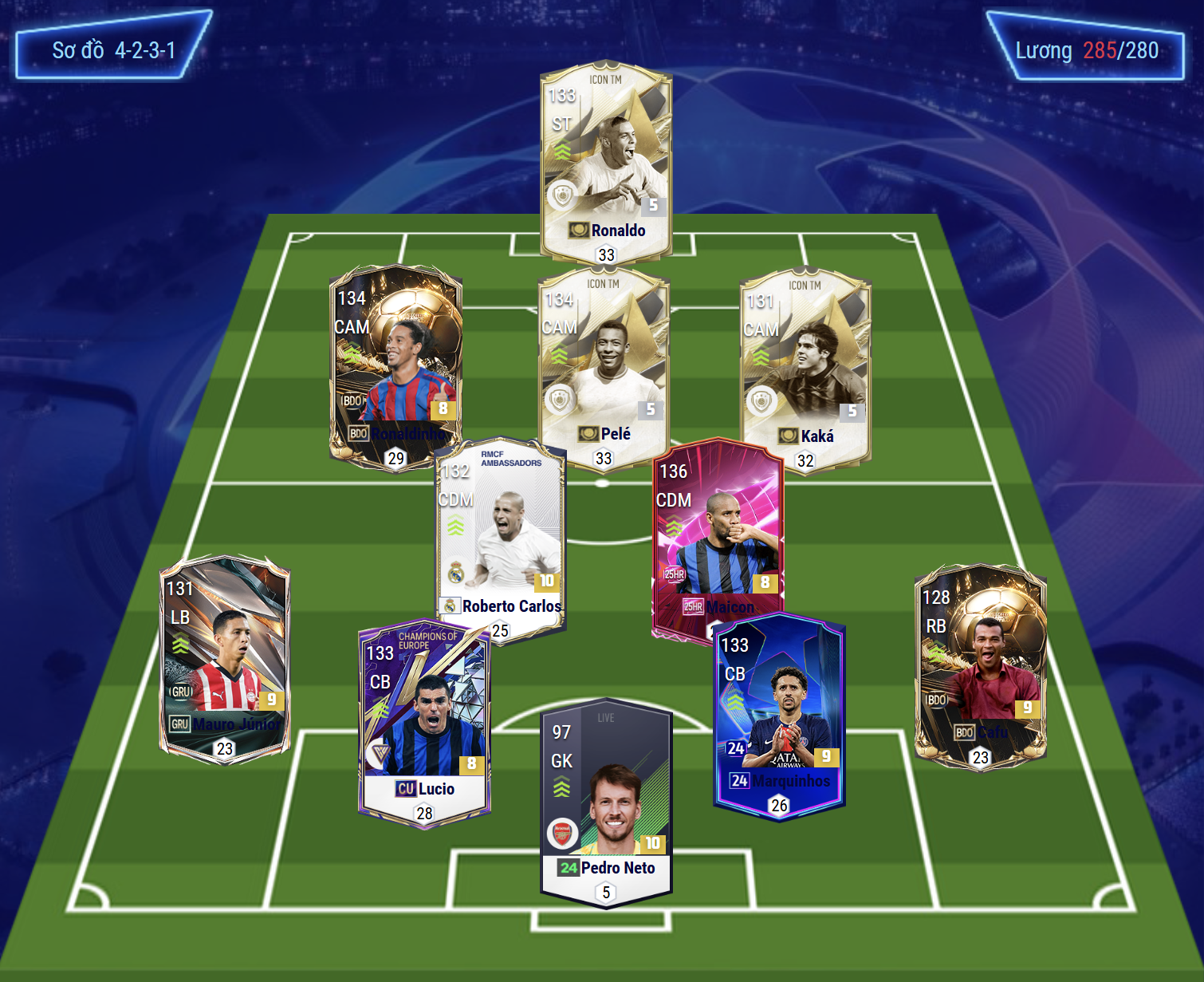 Tiền vệ phòng ngự là sự góp mặt của Roberto Carlos và Maicon, cả 2 đều đảm bảo hiệu quả hỗ trợ phòng ngự, chuyền bóng phối hợp cho đến sút xa. Bộ tứ vệ với Mauro Junior và Cafu sở hữu tốc độ, khả năng phòng ngự biên tốt cùng kỹ năng hỗ trợ tấn công ở mức đủ dùng. Cặp trung vệ Lucio và Marquinhos khá hợp meta hiện tại với tốc độ tốt, kỹ năng tắc bóng khôn cùng khả năng tranh chấp theo kèm đều ổn. Thủ môn Neto là cái tên được tin dùng trong khung gỗ.