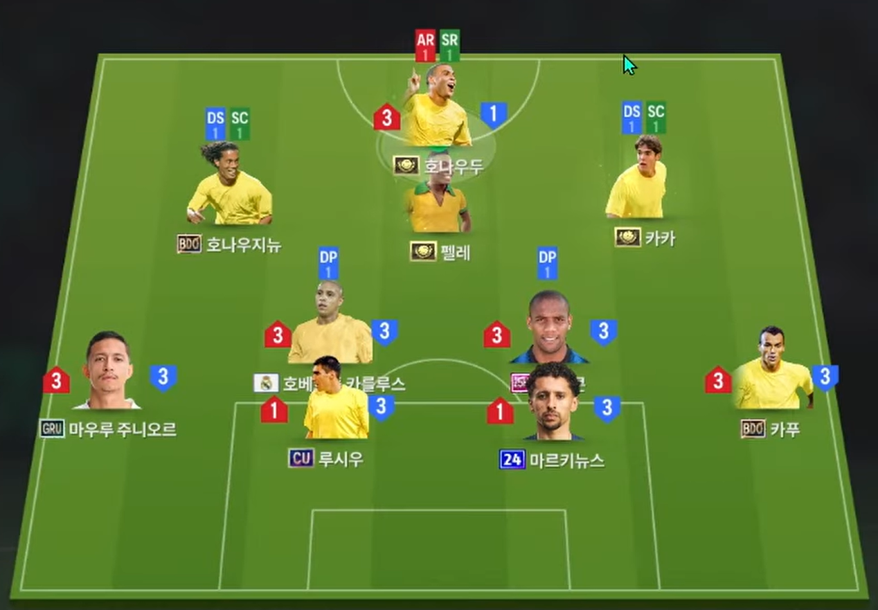 Sơ đồ được lựa chọn cho team color Brazil là sơ đồ 4231 với vị trí tiền đạo cắm là Ronaldo De Lima, một trong những chân sút chất lượng cùng AI di chuyển thông minh hiệu quả hàng đầu game. Bộ 3 tiền vệ tấn công Ronaldinho, Pele và Kaka lần lượt cho 3 vị trí LAM, CAM và RAM với Ronaldinho và Kaka sẽ thi đấu bám biên nhiều hơn trong khi Pele sẽ đá ở vai trò trục giữa với xu hướng dâng cao vừa hỗ trợ kiến tạo vừa ghi bàn khi cần.