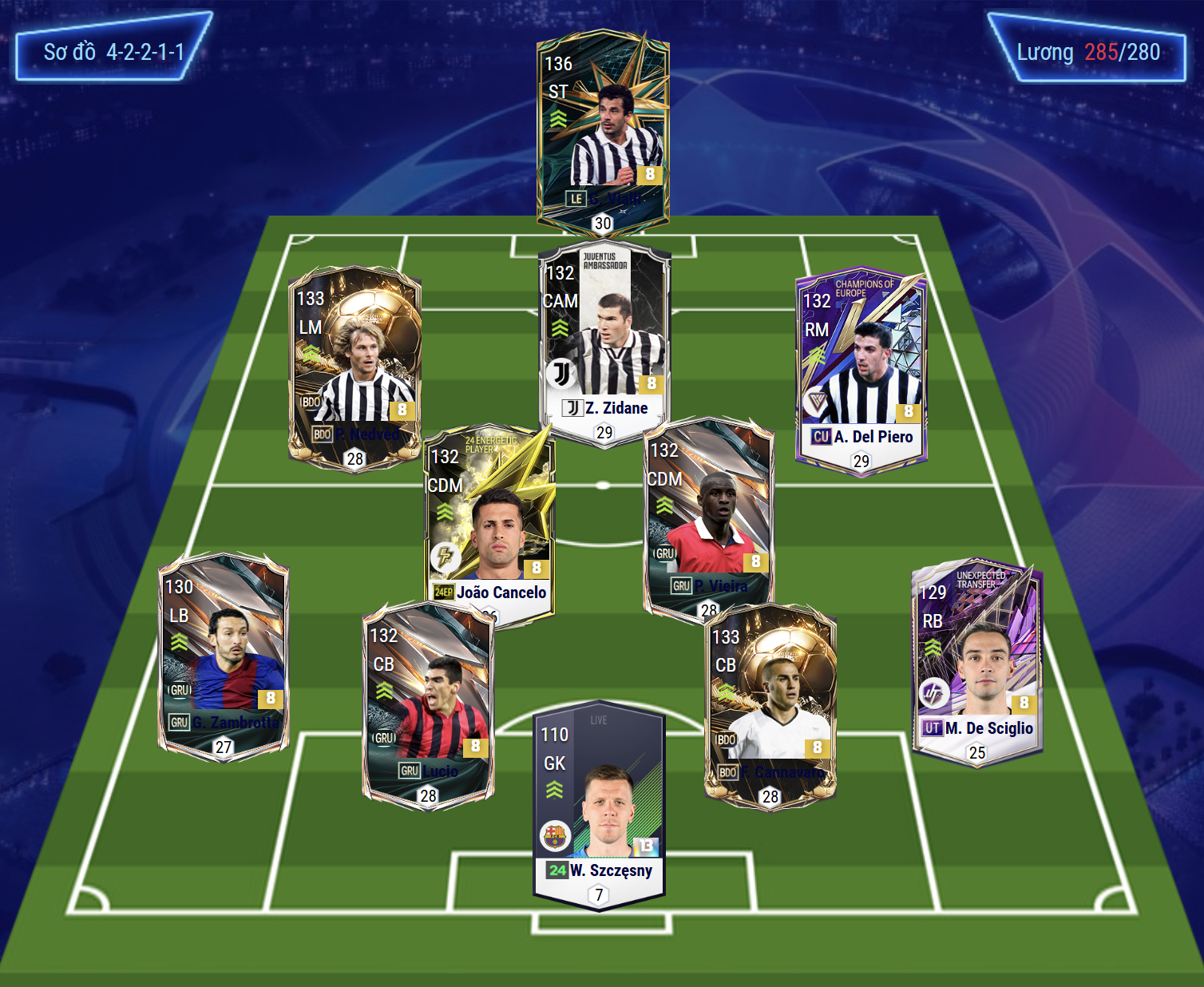 Tiền vệ phòng ngự Cancelo và Vieira là cặp cầu thủ sở hữu khả năng hỗ trợ phòng ngự tốt, tốc độ và kỹ năng chuyền bóng ổn cùng khả năng sút xa khá hiệu quả. Bộ tứ vệ với Zambrotta và De Sciglio là 2 cái tên bám biên quốc dân của Juventus thời gian qua trong khi cặp trung vệ Lucio và Cannavaro lại đem lại tốc độ tốt, AI cắt bóng thông minh rất hợp meta hiện tại. Thủ môn Szczesny là cái tên được tin dùng trong khung gỗ.