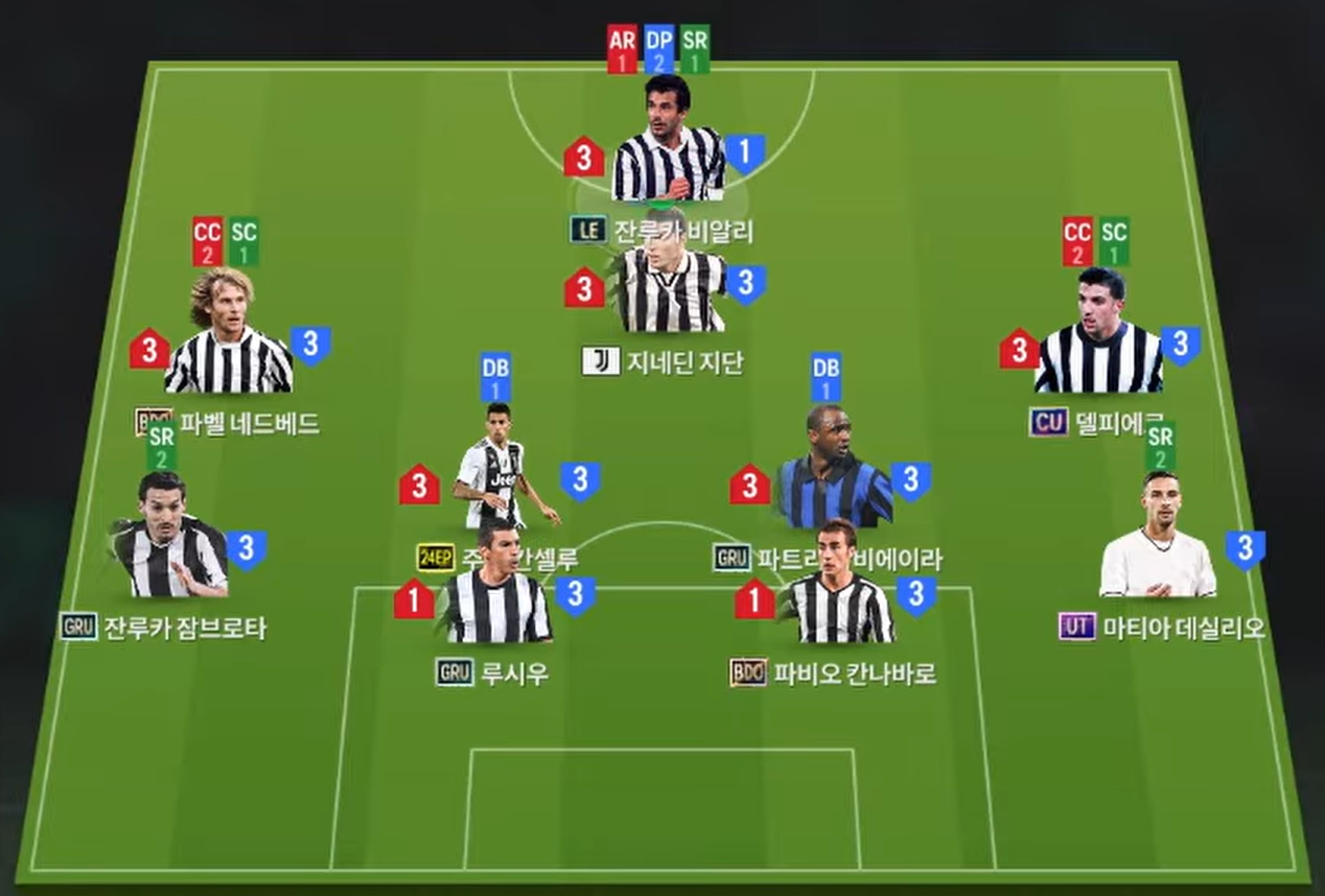 Sơ đồ 42211 được lựa chọn cho Juventus với vị trí tiền đạo cắm là Vialli, một trong những dạng tiền đạo có AI khôn, khả năng di chuyển thống minh cùng bộ kỹ năng dứt điểm chất lượng. Hỗ trợ phía sau là Zidane, tiền vệ người Pháp toàn diện ở khả năng dứt điểm, chuyền bóng cho đến rê dắt xoay sở. Cặp tiền vệ cánh với Nedved và Del Piero sở hữu tốc độ tốt, khả năng chuyền tạt thông minh cùng kỹ năng dứt điểm hiệu quả.