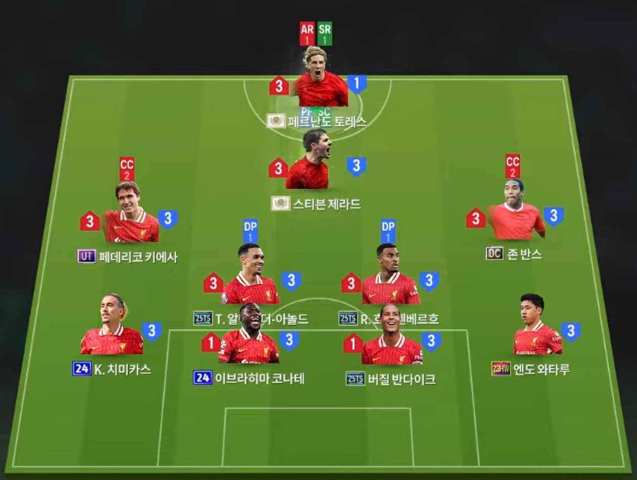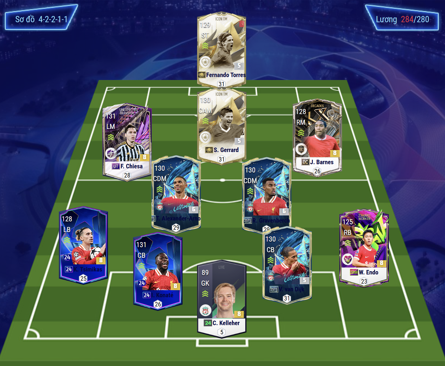 Sơ đồ 42211 được lựa chọn là dạng sơ đồ khá cân bằng với vị trí tiền đạo cắm là Torres ITM, một trong những tiền đạo biểu tượng một thời của Liverpool sở hữu AI chạy chỗ thông minh, khả năng dứt điểm cực kì chính xác và hiệu quả. Hỗ trợ phía sau là Gerrard, một trong những khẩu pháo tầm xa chất lượng với những pha nã đại bác tuyến 2 cực kì chất lượng. Cặp tiền vệ cánh được lựa chọn là Chiesa và Barnes, cả 2 đều cho thấy khả năng bứt tốc, xâm nhập biên tốt cùng bộ kỹ năng chuyền tật lẫn sút bóng cực kì ấn tượng.