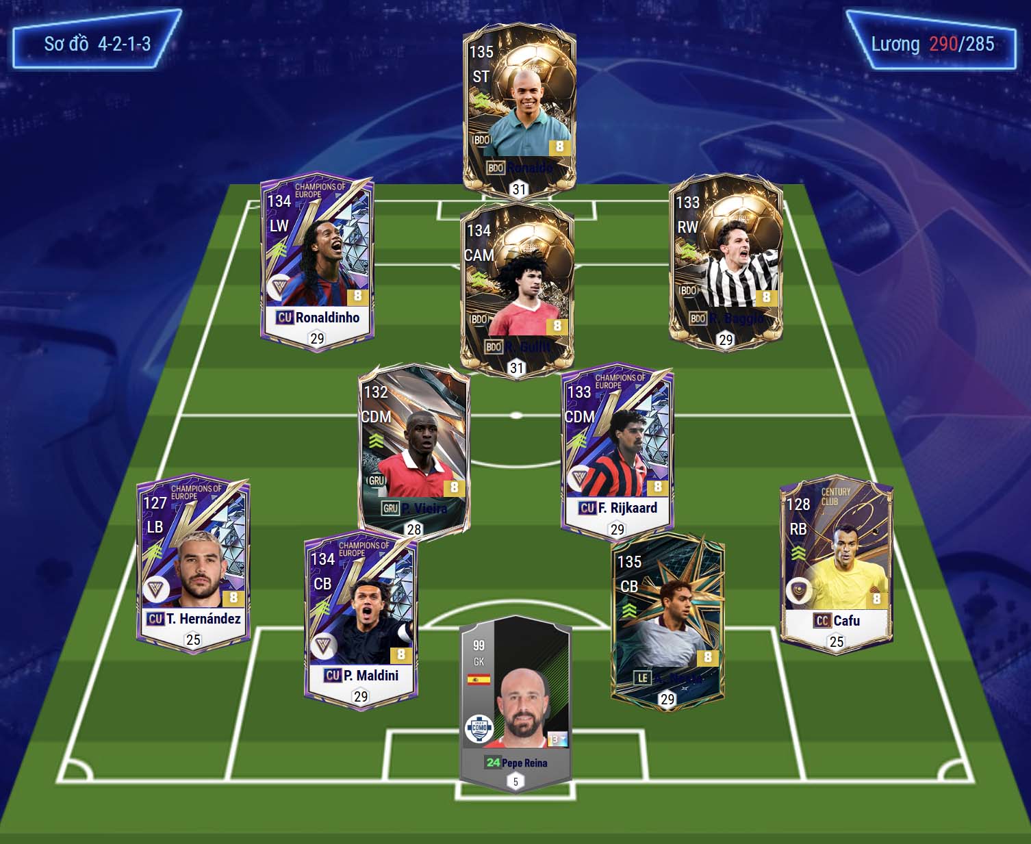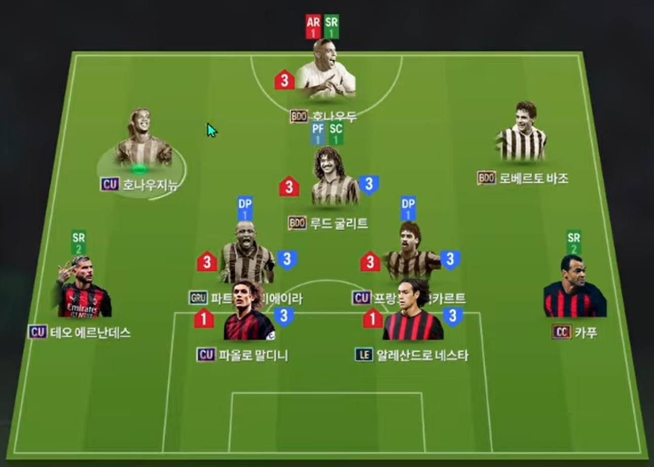 Sơ đồ 4213 được lựa chọn với vị trí tiền đạo cắm là Ronaldo, một trong những trung phong có AI di chuyển cực kì thông minh, tốc độ tốt cùng khả năng dứt điểm đa dạng bằng cả 2 chân. Cặp tiền đạo cánh Ronaldinho và Baggio sở hữu tốc độ, khả năng chuyền tạt ấn tượng cùng bộ kỹ năng rê dắt hiệu quả, không những thế khả năng dứt điểm của cả 2 đều đem lại hiệu quả.