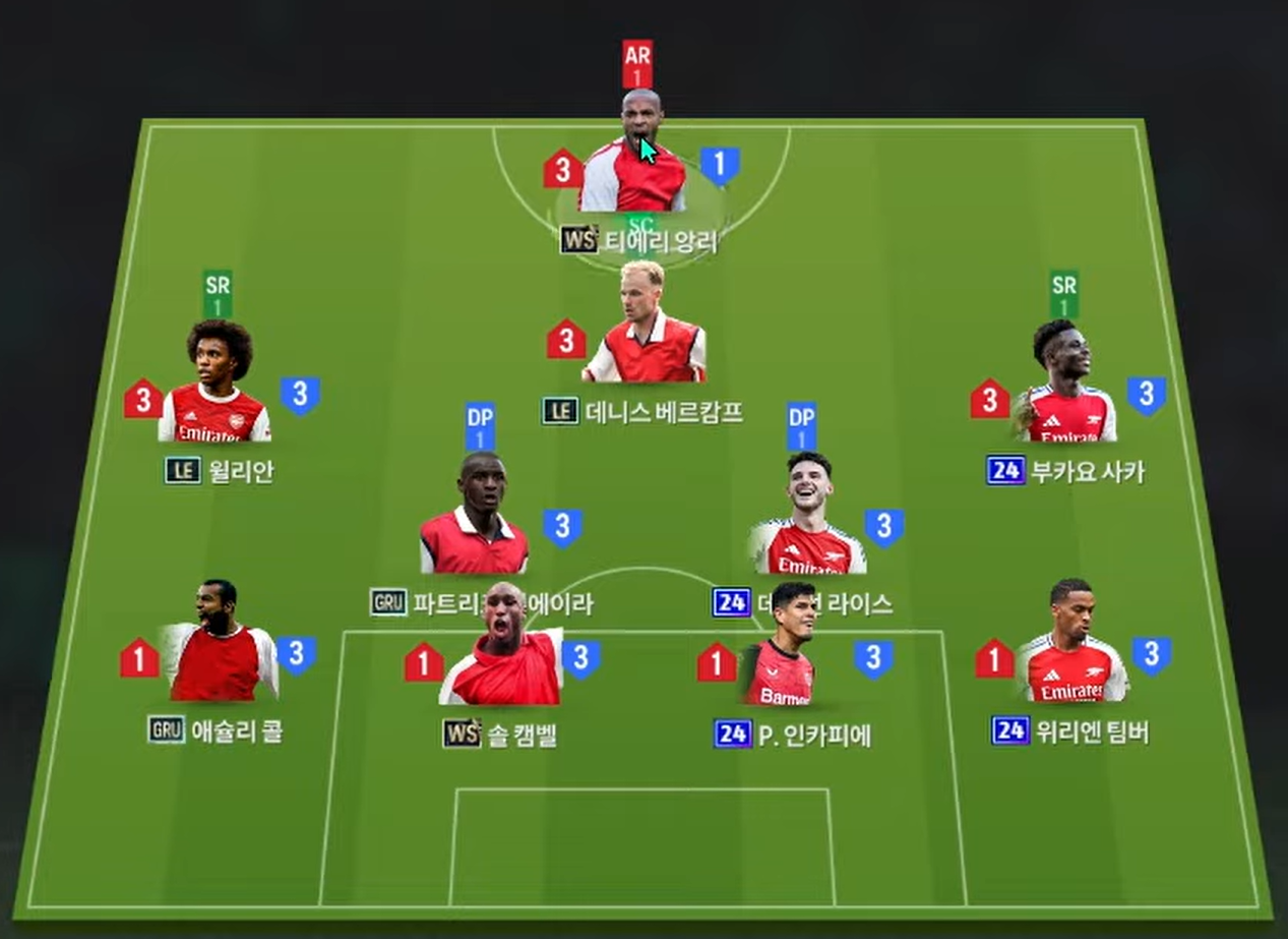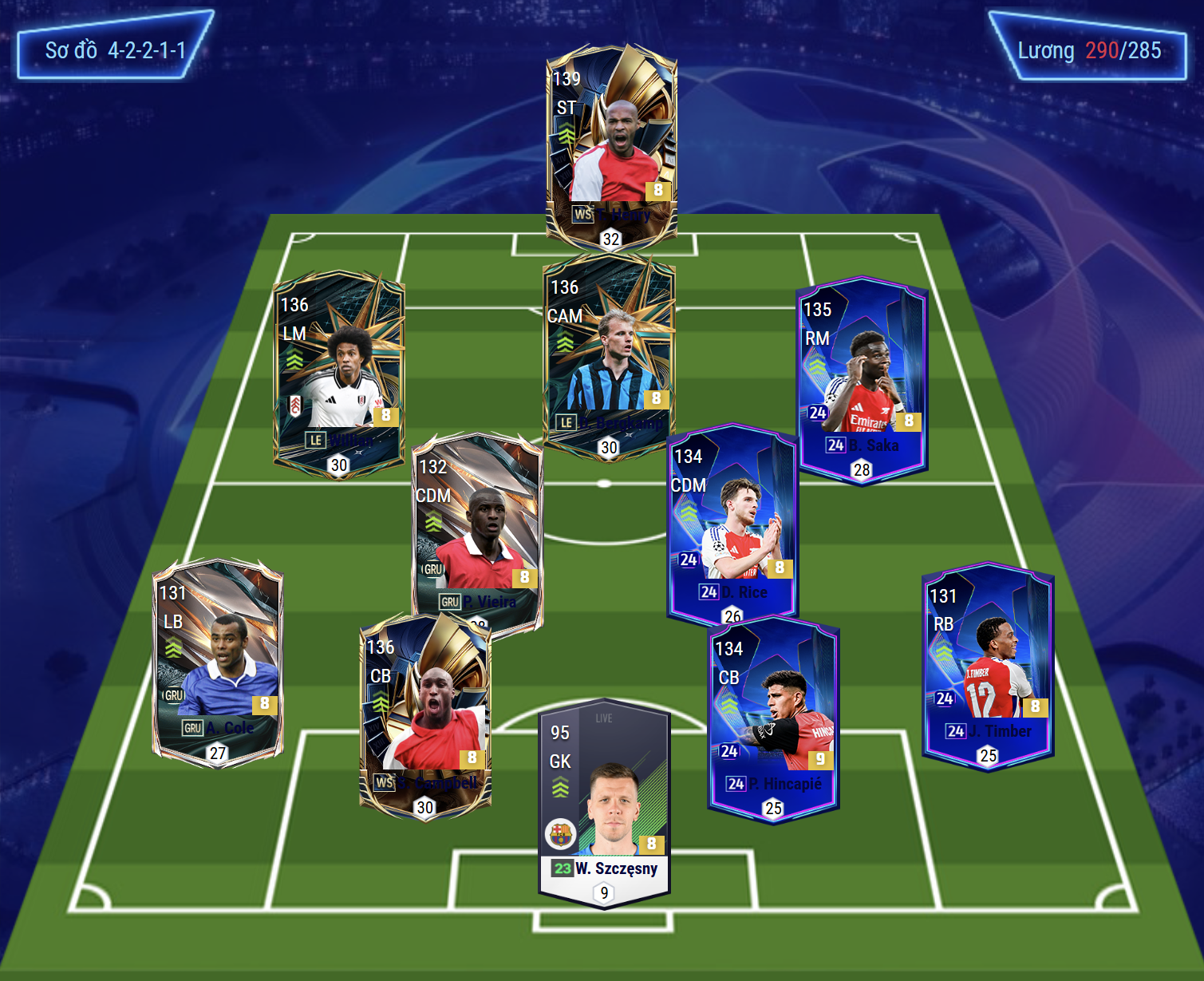Sơ đồ được lựa chọn là sơ đồ 42211 với vị trí tiền đạo cắm là Henry, một trong những trung phong toàn diện bậc nhất của Arsenal thời điểm hiện tại. Hỗ trợ phía sau là Bergkamp, một trong những tiền vệ hộ công cực kì chất lượng và đang là hot pick thời điểm hiện tại bởi khả năng chuyền bóng và sút xa xuất sắc. Cặp tiền vệ cánh Willian và Saka là cái tên được tin dùng với tốc độ tốt, khả năng chuyền tạt lẫn sút bóng hiệu quả.
