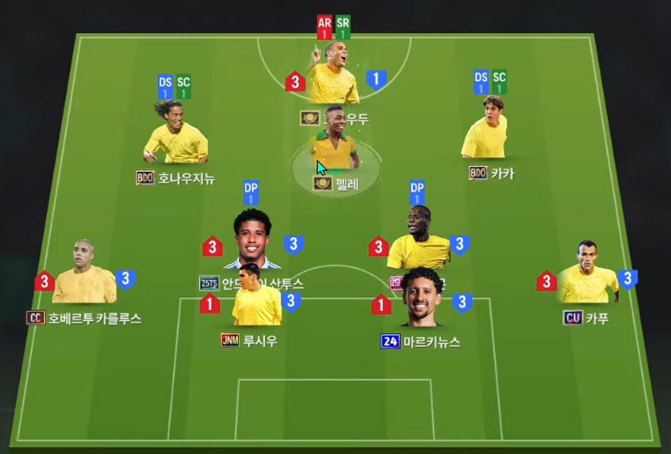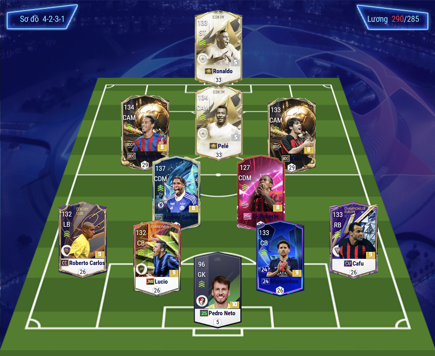 Sơ đồ 4231 được lựa chọn với vị trí tiền đạo cắm là Ronaldo de Lima, đây là một trong những tiền đạo hàng đầu game và không bao giờ bị lỗi thời ở hầu hết các meta nhờ sở hữu tốc độ, khả năng dứt điểm đa dạng bằng cả 2 chân, kỹ năng rê dắt cho đến AI chạy chỗ đều cực kì hiệu quả. Bộ 3 tiền vệ tấn công Ronaldinho, Pele và Kaka cho 3 vị trí LAM, CAM và RAM. Cả 3 đều là những chân chạy tốc độ, khả năng chuyền tạt cho đến sút xa ấn tượng cùng kỹ năng rê dắt bóng cực kì dẻo.