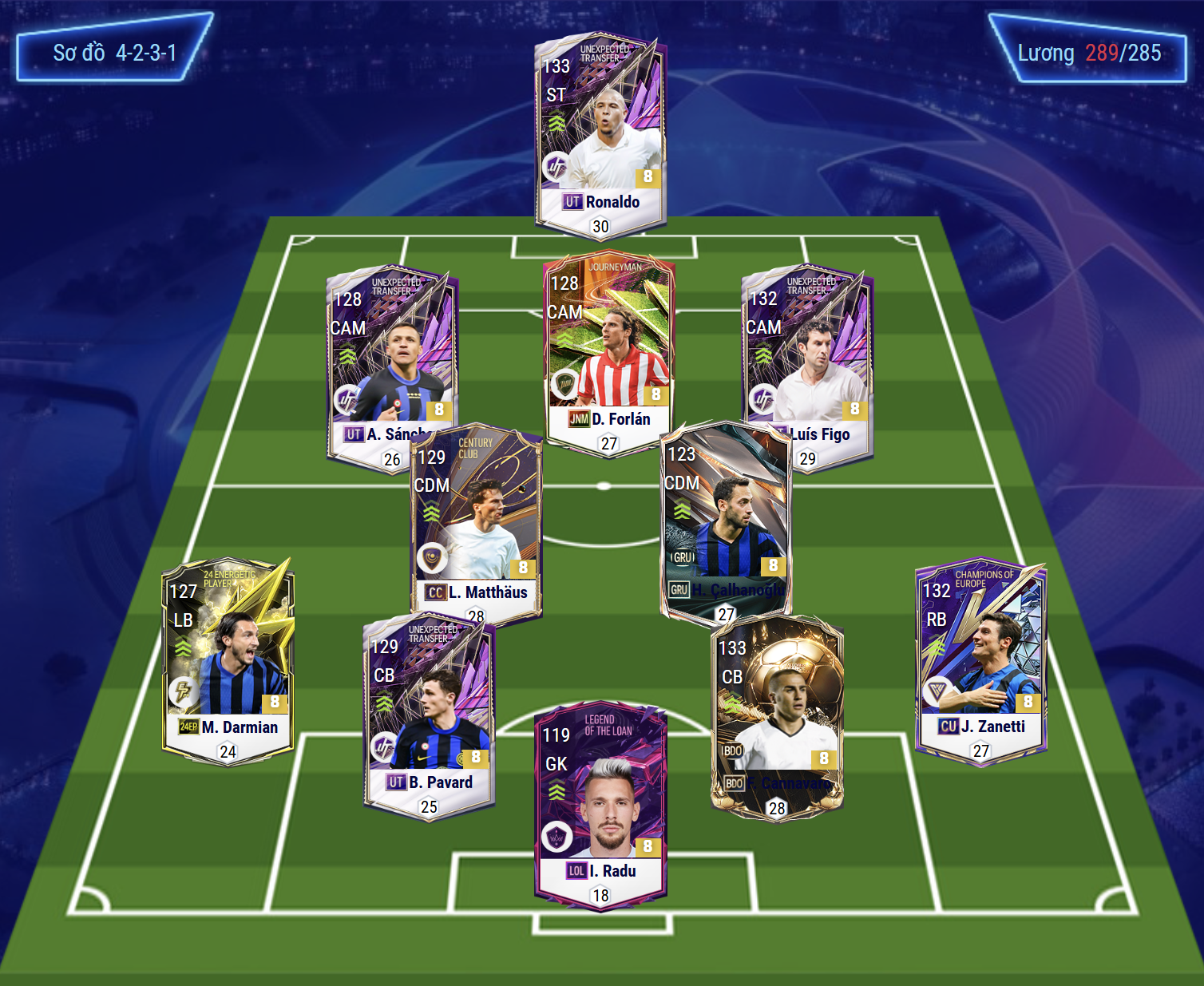 Sơ đồ 4231 được lựa chọn với vị trí tiền đạo cắm là Ronaldo de Lima, đây là tiền đạo cắm sở hữu tốc độ, khả năng rê dắt tốt cũng như dứt điểm cực kì toàn diện bằng cả 2 chân. Hỗ trợ phía sau là bộ 3 tiền vệ công Sanchez, Forlan và Figo cho 3 vị trí LAM, CAM và RAM. Trong đó Sanchez và Figo sẽ bám biên nhiều hơn trong khi Forlan sẽ đá như 1 hộ công phía sau tiền đạo.