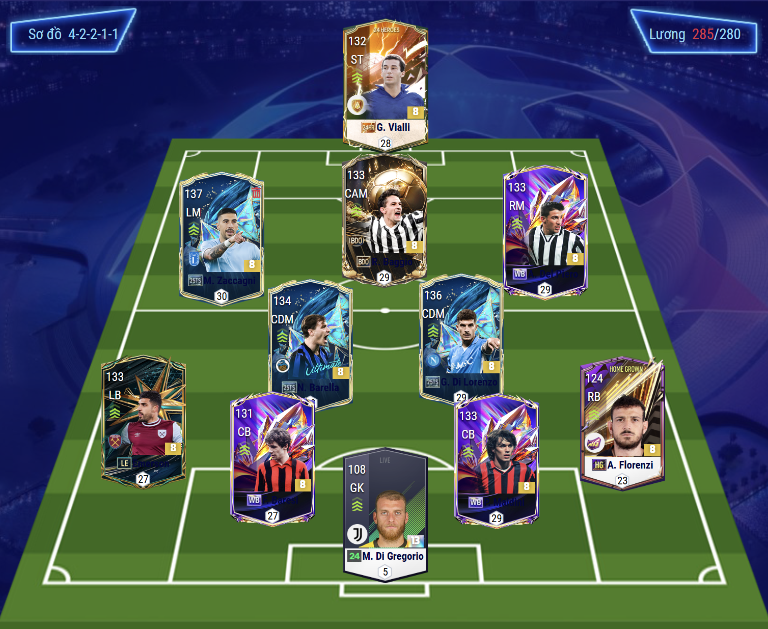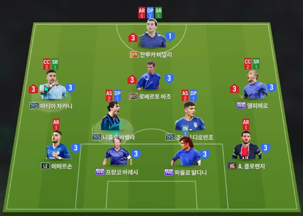 Tiền vệ phòng ngự là bộ đôi Barella và Di Lorenzo, cả 2 đều là những mẫu cầu thủ đa năng, có thể chơi ở nhiều vị trí khác nhau trong đội hình thi đấu tốt từ khả năng chuyền bóng, phối hợp ban bật cho đến hỗ trợ phòng ngự tốt. Bộ tứ vệ với Emerson và Florenzi sở hữu khả năng tăng tốc tốt, kỹ năng chuyền tạt và hỗ hõ trợ tấn công cánh khá ấn tượng. Cặp trung vệ Baresi và Maldini là những cái tên chất lượng cho hàng thủ ở meta hiện tại, cả 2 đều sở hữu tốc độ và AI tắc bóng khôn cùng với khả năng phòng ngự ấn tượng. Thủ môn là cái tên Di Gregorio được tin dùng trong khung gỗ.
