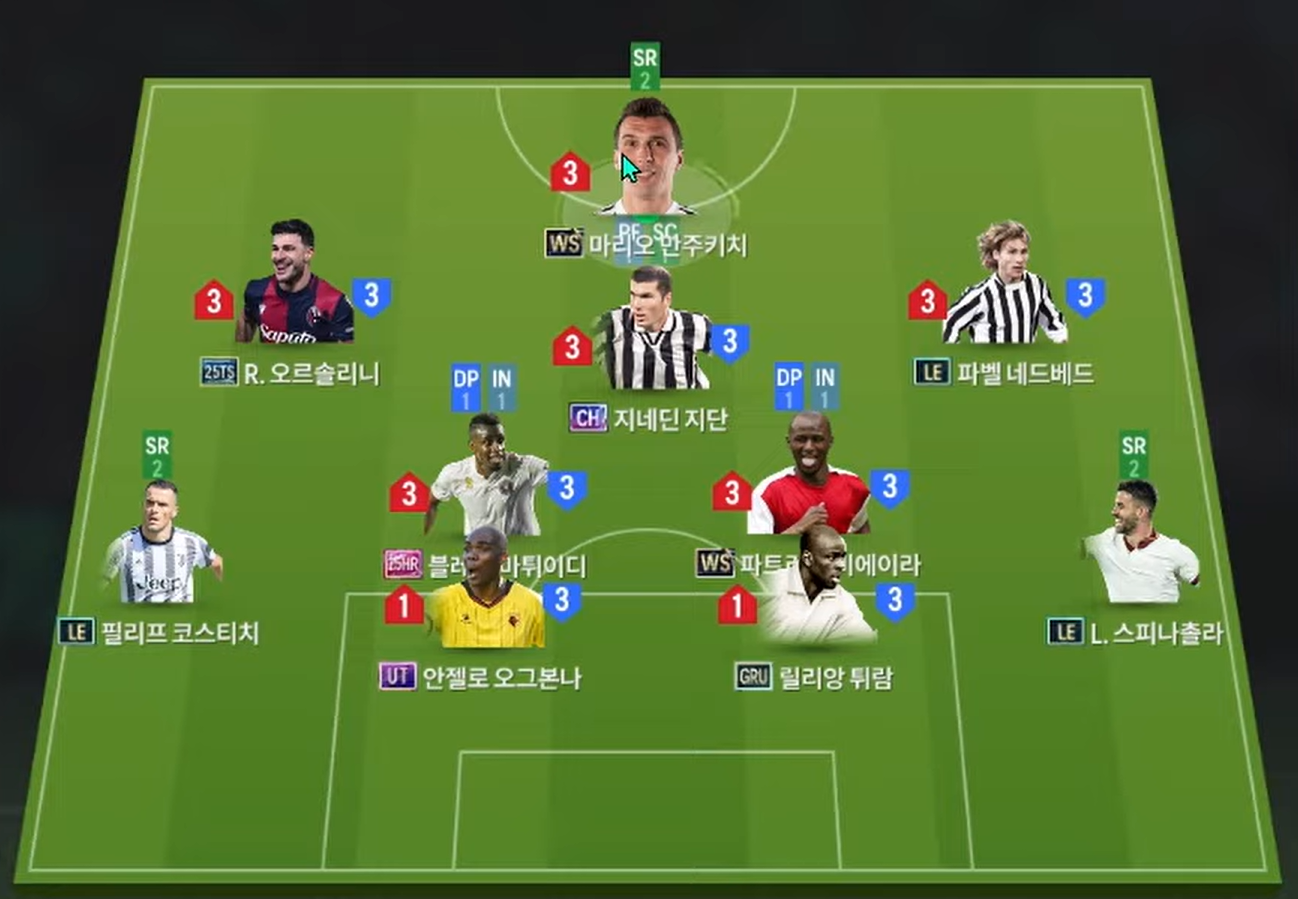 Sơ đồ 4231 được lựa chọn với vị trí tiền đạo cắm là Mandzukic, một trong những trung phong mục tiêu giỏi không chiến và có khả năng dứt điểm rất hiệu quả trong phạm vi vòng cấm. Hỗ trợ phía sau là bộ 3 tiền vệ tấn công Orsolini, Zidane và Nedved cho 3 vị trí LAM, CAM và RAM. Trong đó Orsolini và Nedved sẽ có xu hướng bám biên nhiều hơn trong khi Zidane sẽ thi đấu như 1 tiền vệ hộ công.