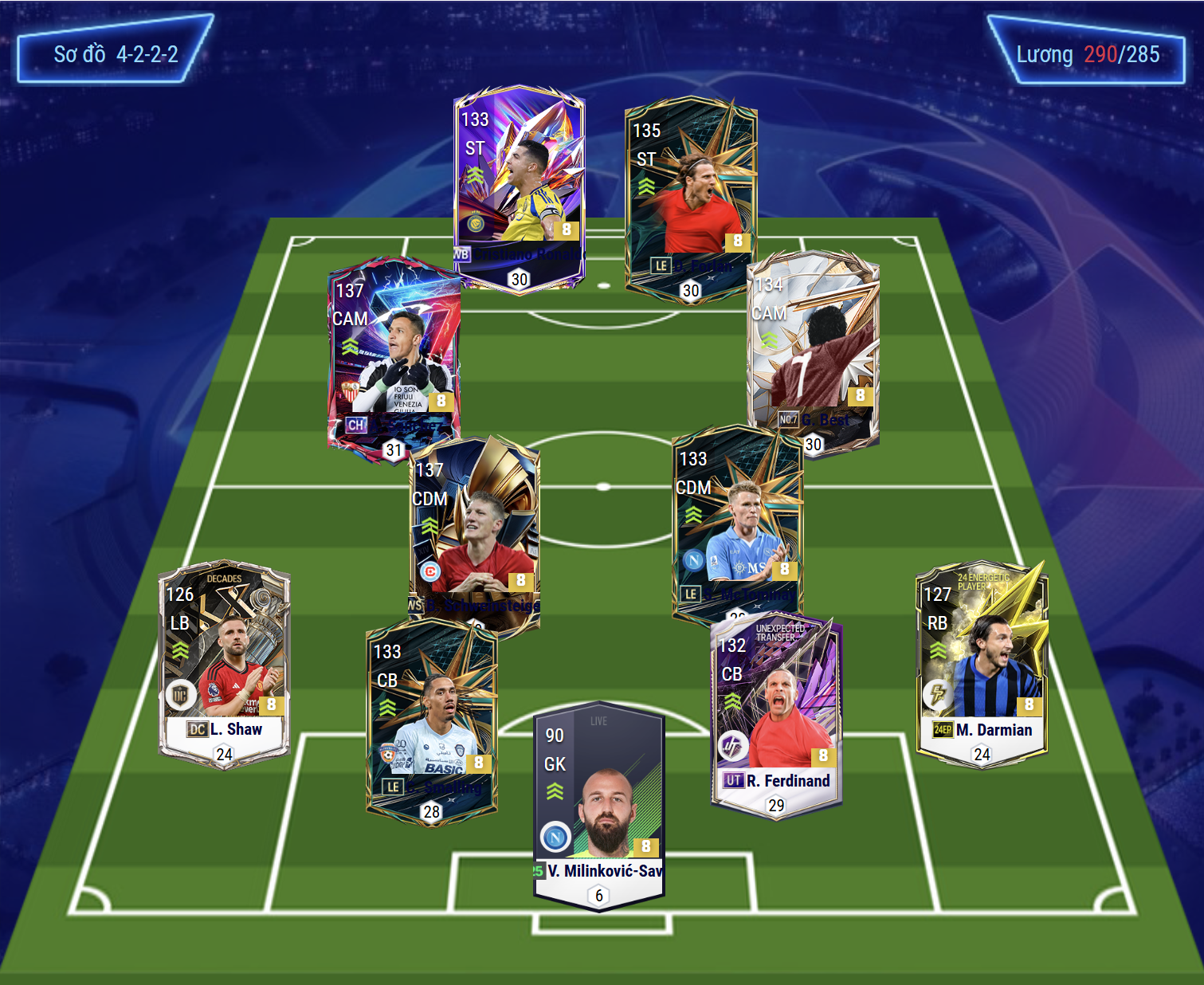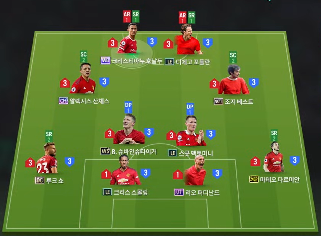 Sơ đồ 4222 được lựa chọn với vị trí tiền đạo cắm Cristiano Ronaldo và Forlan đều là những cái tên toàn diện ở khả năng dứt điểm cả trong lẫn ngoài vòng cấm, lực sút căng, AI di chuyển khôn cùng khả năng phối hợp hiệu quả. Hỗ trợ phía sau là cặp tiền vệ công Sanchez và Best cho 2 vị trí LAM, RAM. Cả 2 sẽ có xu hướng bám biên nhiều hơn, sở hữu tốc độ tốt, khả năng chuyền tạt cho tới xâm nhập dứt điểm đều hiệu quả.