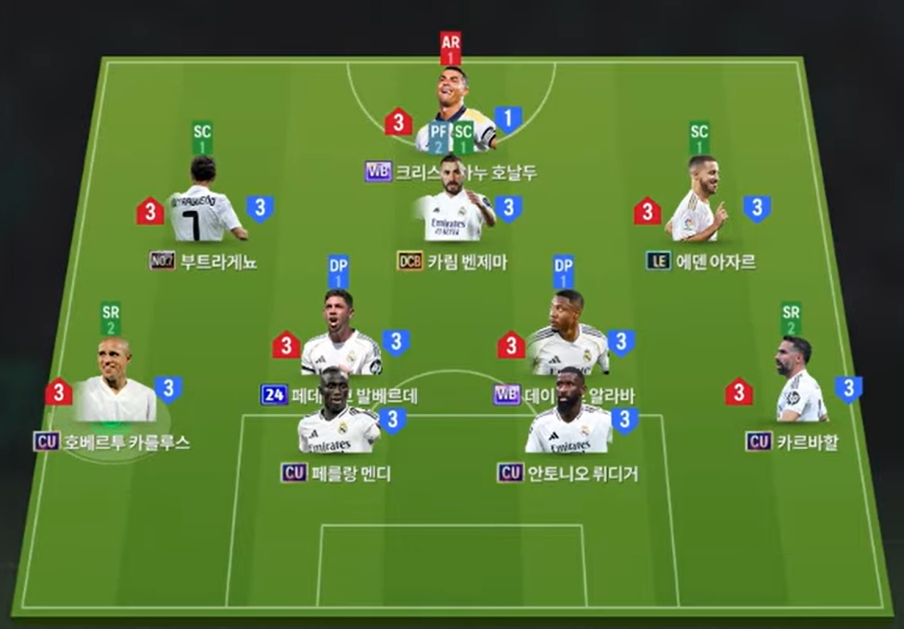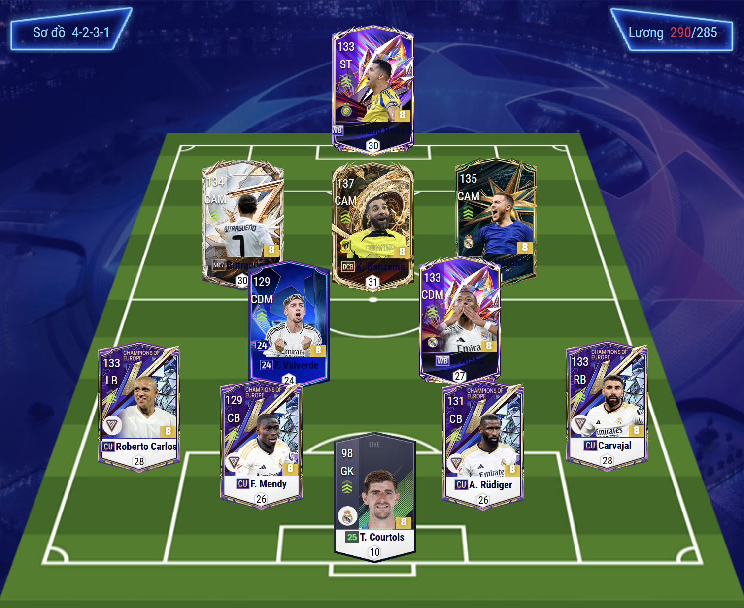 Sơ đồ 4231 được lựa chọn với vị trí tiền đạo cắm là Cristiano Ronaldo, cầu thủ người Bồ sở hữu khả năng thi đấu toàn diện cho vị trí tiền đạo cắm từ tốc độ, khả năng xử lý bóng, dứt điểm hiệu quả bằng cả 2 chân cho tới kỹ năng không chiến đều đảm bảo chất lượng. Bộ 3 tiền vệ công lần lượt là Butragueno, Benzema, Hazard cho 3 vị trí LAM, CAM và RAM trong đó Butragueno và Hazard sẽ thi đấu bám biên nhiều hơn còn Benzema sẽ đá như 1 hộ công hỗ trợ trực diện cho Ronaldo ở phía trên.