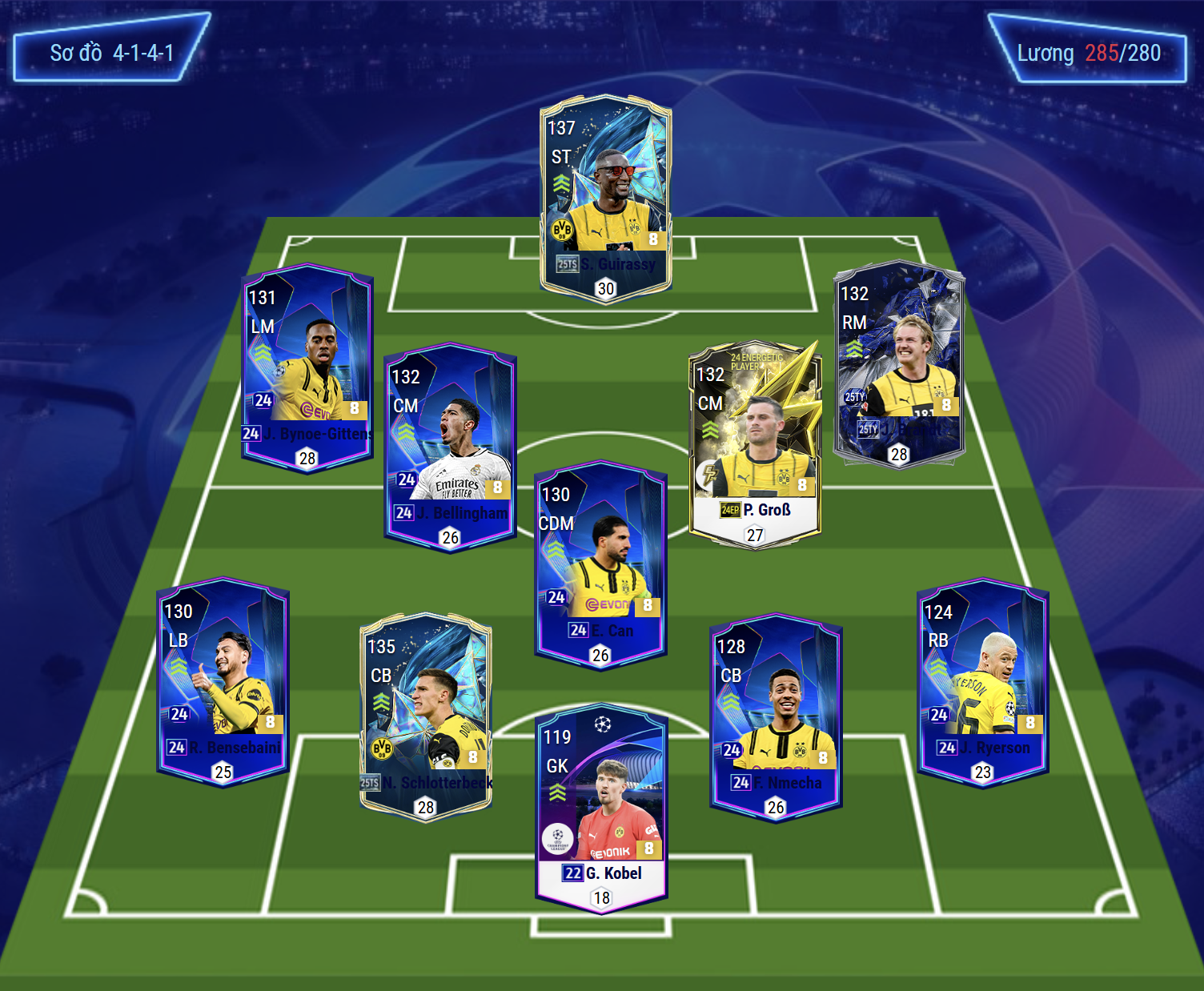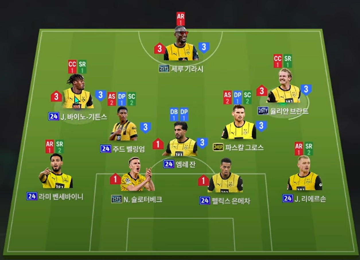 Sơ đồ 4141 được tin dùng với khả năng kiểm soát bóng và ban bật tuyến giữa cực kì khó chịu ở meta hiện tại. Tiền đạo cắm Guirassy là cái tên được tin dùng cho vị trí cao nhất trên hàng công. 2 bên hành lang cánh là sự góp mặt của tài năng trẻ Bynoe-Gittens và Brandt, cả 2 đều là những cái tên có tốc độ ổn, khả năng chuyền tại phối hợp hỗ trợ đồng đội tối.