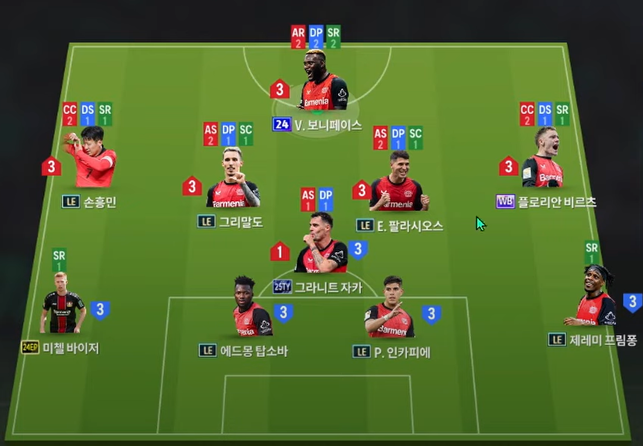 Sơ đồ 4141 được lựa chọn với vị trí tiền đạo cắm là Boniface, một trong những mầu tiền đạo to cao hộ pháp và có khả năng dứt điểm đa dạng hiệu quả. 2 cầu thủ thi đấu ở hành lang cánh lần lượt là Son Heung Min và Wirtz. Cả 2 đều cho thấy hiệu quả ở khả năng dứt điểm chuyền tạt bóng, rê dắt xử lý cho đến khả năng xâm nhập. Cặp tiền vệ trung tâm Grimaldo và Palacios vừa sở hữu khả năng chuyền bóng, thi đấu lên xuống nổi hỗ trợ bao quát tuyến giữa ấn tượng.
