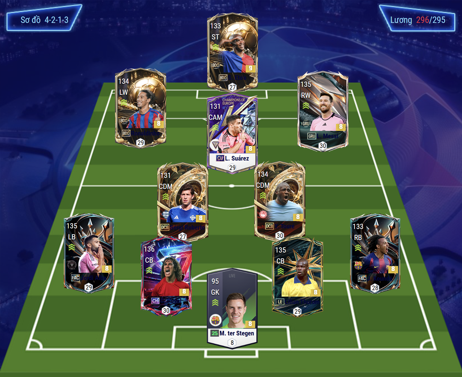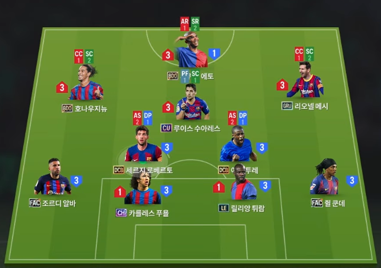 Sơ đồ 4213 được lựa chọn cho team color Barcelona với vị trí tiền đạo cắm là Eto'o, anh sở hữu tốc độ, khả năng dứt điểm nhạy bén bằng cả 2 chân cùng AI di chuyển không bóng cực kì khôn. Tiền đạo cánh LW, RW lần lượt là Ronaldinho và Messi, cặp đôi này sở hữu tốc độ, khả năng rê dắt cực kì dẻo cùng bộ kỹ năng sút bóng chính xác và đầy khó chịu.