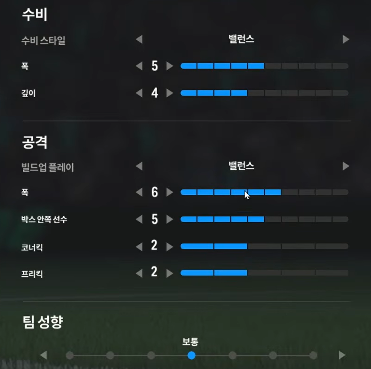 Trong khi, thiết lập tấn công "cân bằng" sẽ phù hợp cho lối chơi kiểm soát bóng, triển khai thế trận chậm, chắc ở tuyến giữa và ban bật với các vệ tinh trên hàng công để mở ra khoảng trống và ghi bàn. Ở lối chơi tấn công này, xu hướng triển khai sẽ là xu hướng chậm, chắc bóng và tìm kiếm cơ hội thay vì tấn công tổng lực và tốc độ cao.