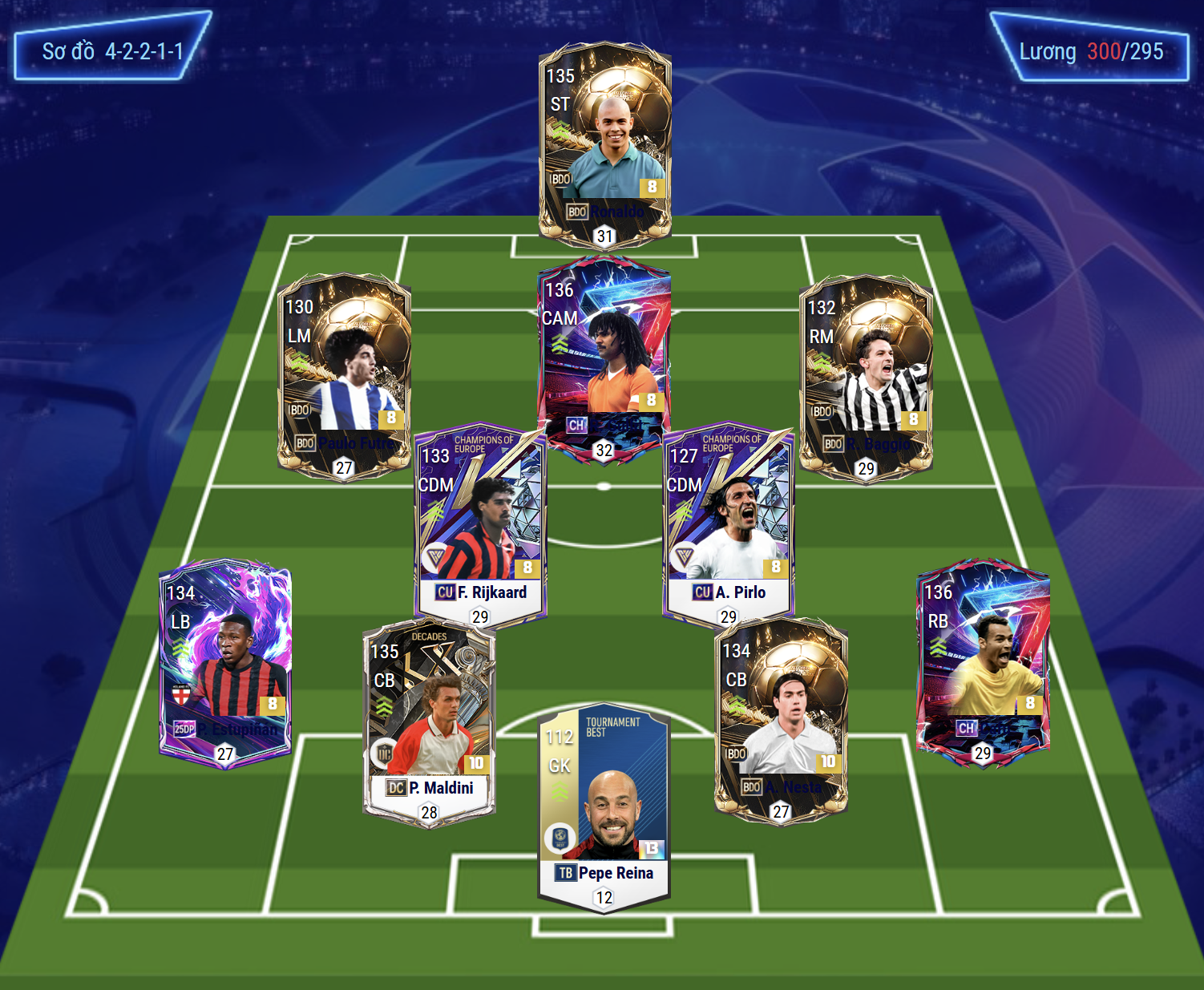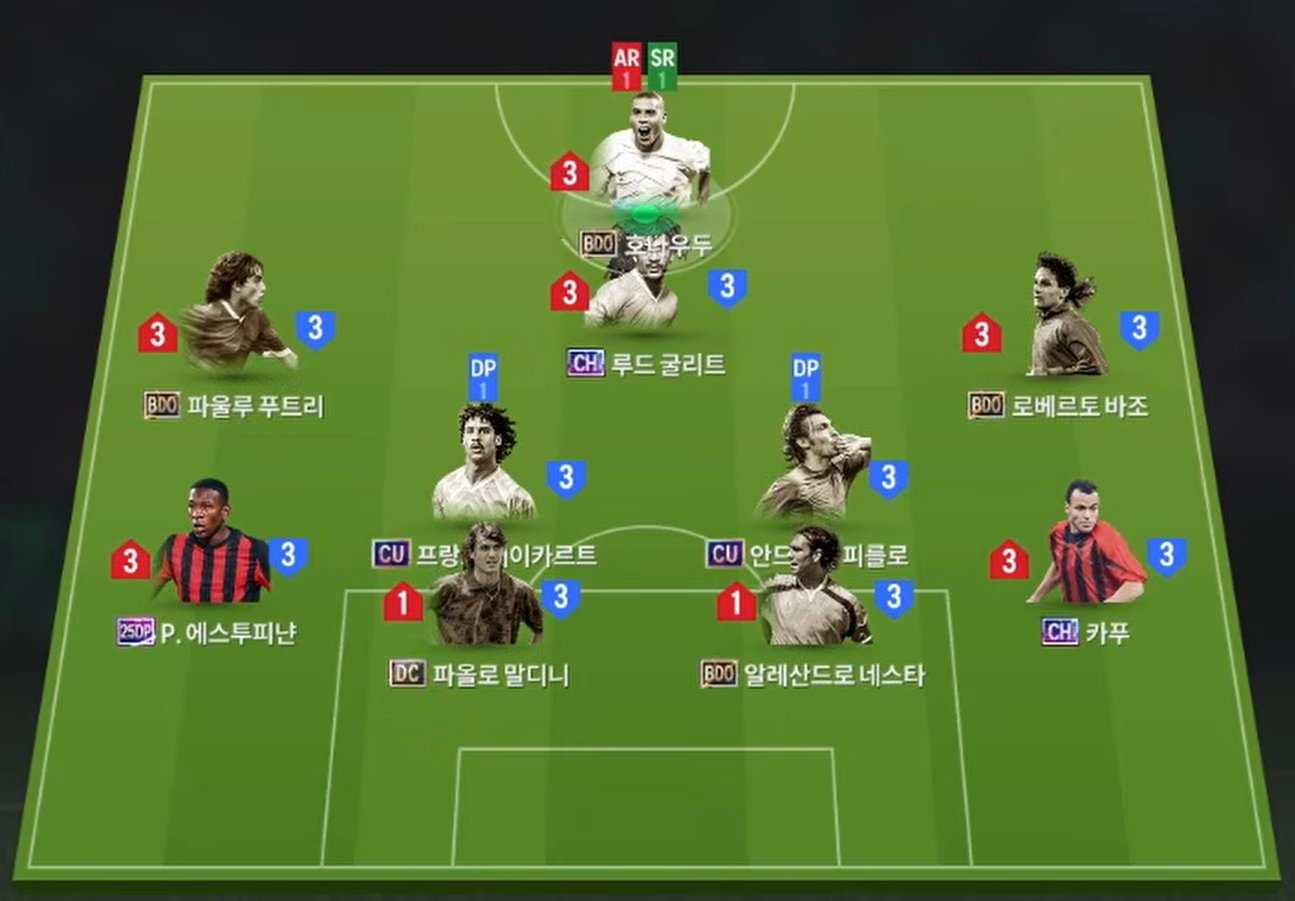 Sơ đồ 42211 được lựa chọn với vị trí tiền đạo cắm là Ronaldo de lima, cầu thủ người Brazil sở hữu khả năng rê dắt và dứt điểm tốt bằng cả 2 chân, AI di chuyển nổi bật tạo nên hiệu quả. Tiền vệ tấn công Gullit là mẫu cầu thủ toàn diện hàng đầu game sở hữu thể hình, khả năng chuyền bóng tốt, xoay sở rê dắt linh hoạt cùng khả năng không chiến cũng khá hiệu quả.