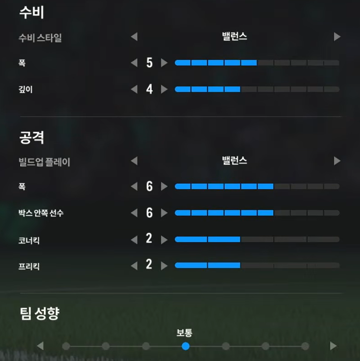 Trong khi, thiết lập tấn công "cân bằng" sẽ phù hợp cho lối chơi kiểm soát bóng, triển khai thế trận chậm, chắc ở tuyến giữa và ban bật với các vệ tinh trên hàng công để mở ra khoảng trống và ghi bàn. Ở lối chơi tấn công này, xu hướng triển khai sẽ là xu hướng chậm, chắc bóng và tìm kiếm cơ hội thay vì tấn công tổng lực và tốc độ cao.