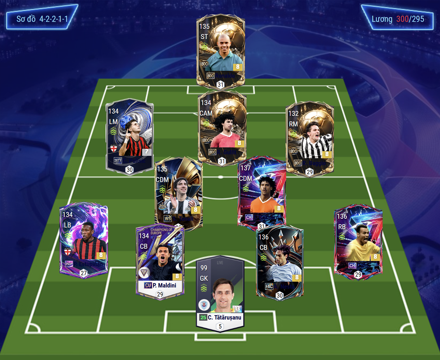 Sơ đồ 42211 được lựa chọn với vị trí tiền đạo cắm là Ronaldo de lima, cầu thủ người Brazil sở hữu tốc độ cùng khả năng dứt điểm toàn diện bằng cả 2 chân. Hỗ trợ phía sau là tiền vệ tấn công Gullit, một cái tên gần như toàn diện nhất game trên hàng công giúp tối ưu hóa khả năng ghi bàn của toàn đội.