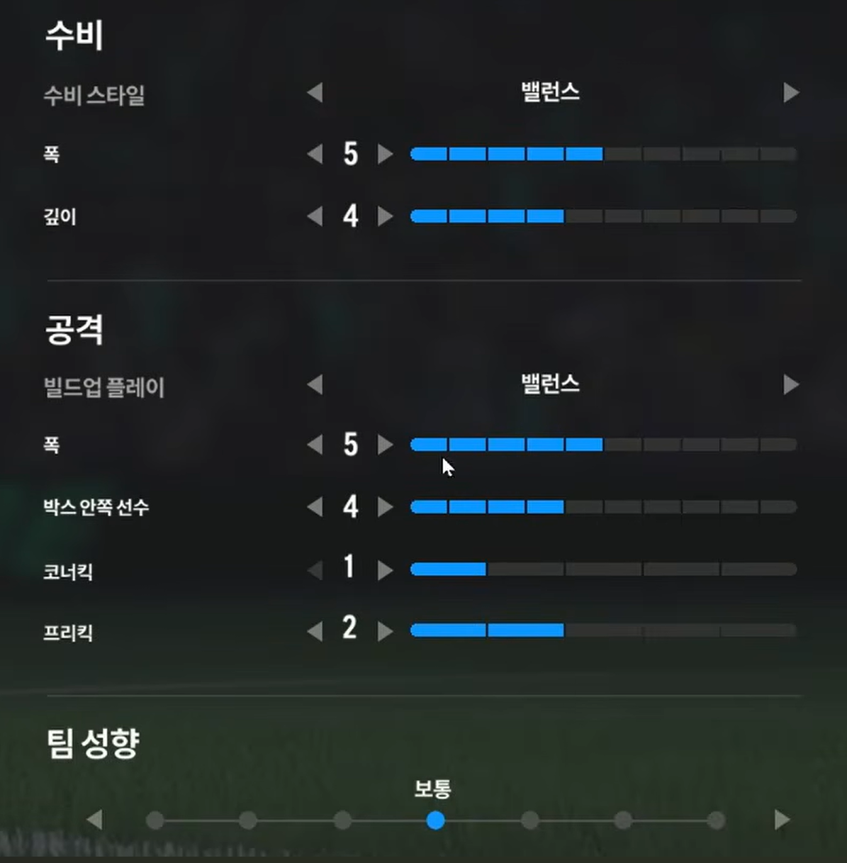 Trong khi, thiết lập tấn công "cân bằng" sẽ phù hợp cho lối chơi kiểm soát bóng, triển khai thế trận chậm, chắc ở tuyến giữa và ban bật với các vệ tinh trên hàng công để mở ra khoảng trống và ghi bàn. Ở lối chơi tấn công này, xu hướng triển khai sẽ là xu hướng chậm, chắc bóng và tìm kiếm cơ hội thay vì tấn công tổng lực và tốc độ cao.