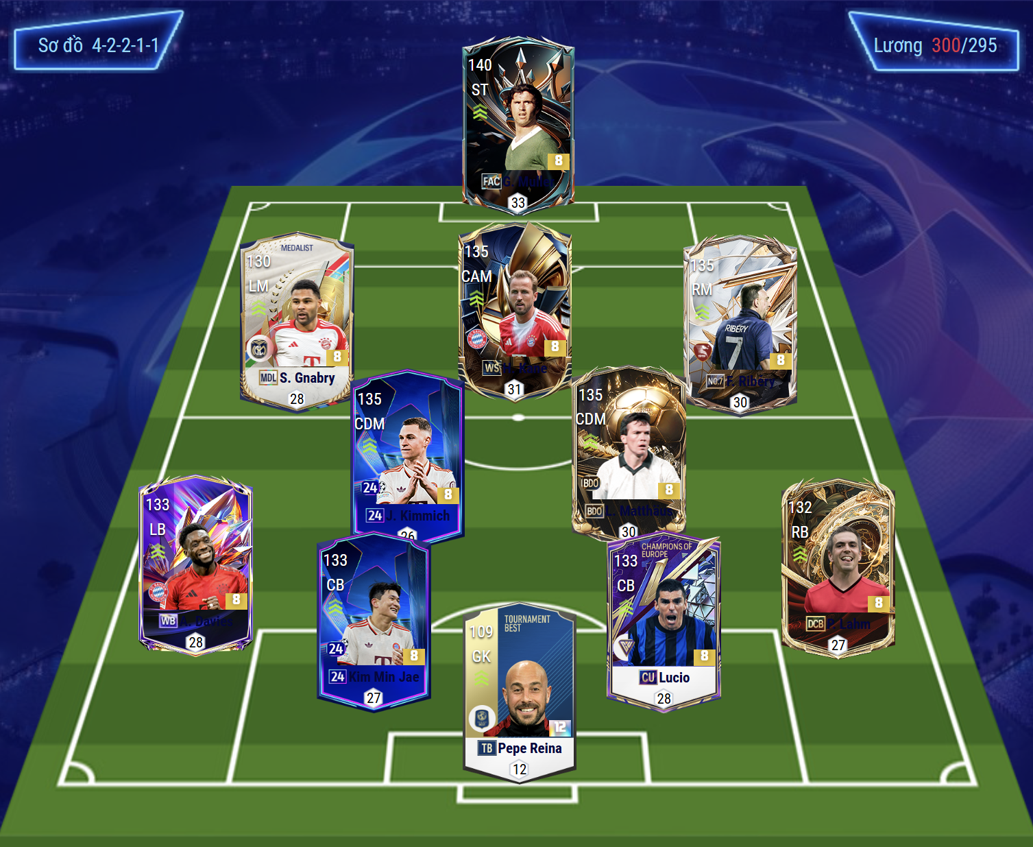 Sơ đồ 42211 được lựa chọn với vị trí tiền đạo cắm là Gerdf Muller, cầu thủ người Đức là mẫu tiền đạo săn bàn cực kì hiệu quả bởi AI dứt điểm bằng cả 2 chân, khả năng sút bóng tốt cùng bộ kỹ năng không chiến khá hiệu quả. Hỗ trợ phía sau là Kane, mẫu tiền đạo đa năng vừa có khả năng ghi bàn vừa có lối chơi kiến tạo hỗ trợ phía trên hiệu quả.