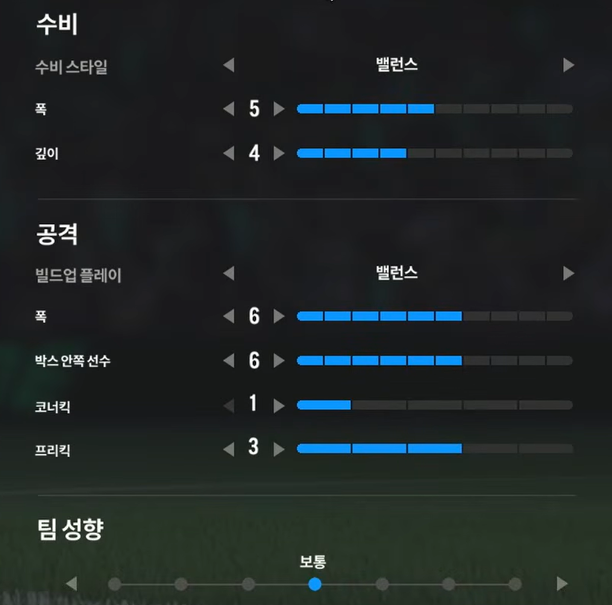 Trong khi, thiết lập tấn công "cân bằng" sẽ phù hợp cho lối chơi kiểm soát bóng, triển khai thế trận chậm, chắc ở tuyến giữa và ban bật với các vệ tinh trên hàng công để mở ra khoảng trống và ghi bàn. Ở lối chơi tấn công này, xu hướng triển khai sẽ là xu hướng chậm, chắc bóng và tìm kiếm cơ hội thay vì tấn công tổng lực và tốc độ cao.