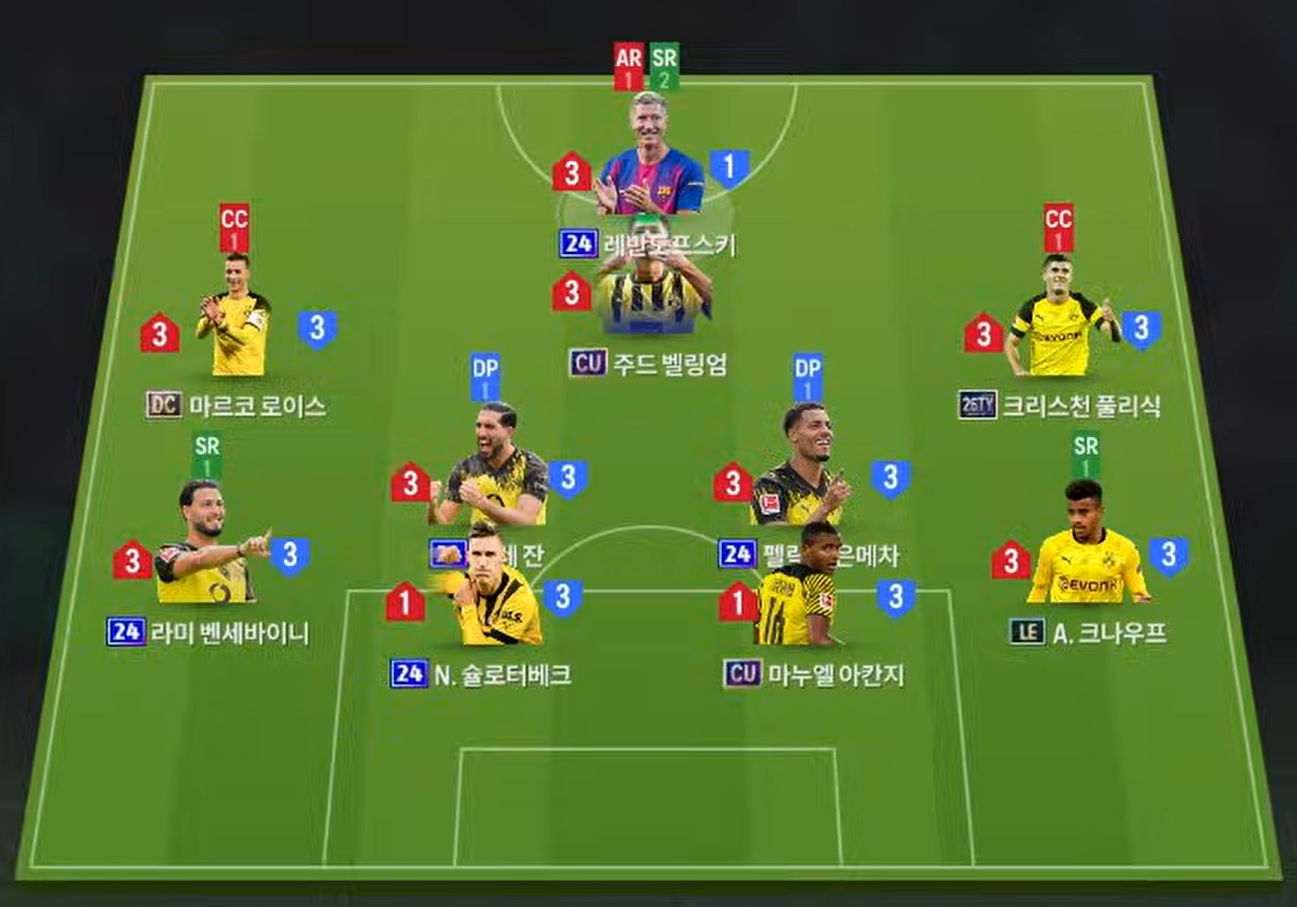 Sơ đồ được lựa chọn cho team color Dortmund là sơ đồ 42211 với vị trí tiền đạo cắm là Lewandowski, cầu thủ người Ba Lan sở hữu khả năng dứt điểm toàn diện từ không chiến, khả năng dứt điểm tốt 2 chân cùng AI di chuyển chọn vị trí thông minh. Hỗ trợ phía sau là Bellingham, sự toàn diện từ chuyền bóng, rê dắt bóng tới sút xa của cầu thủ này cực kì hiệu quả.