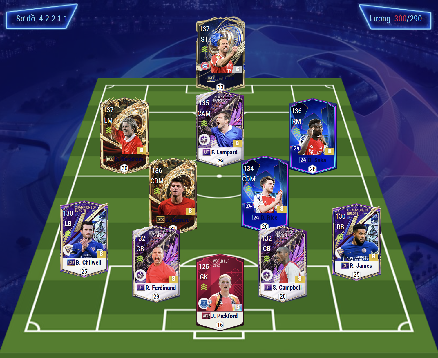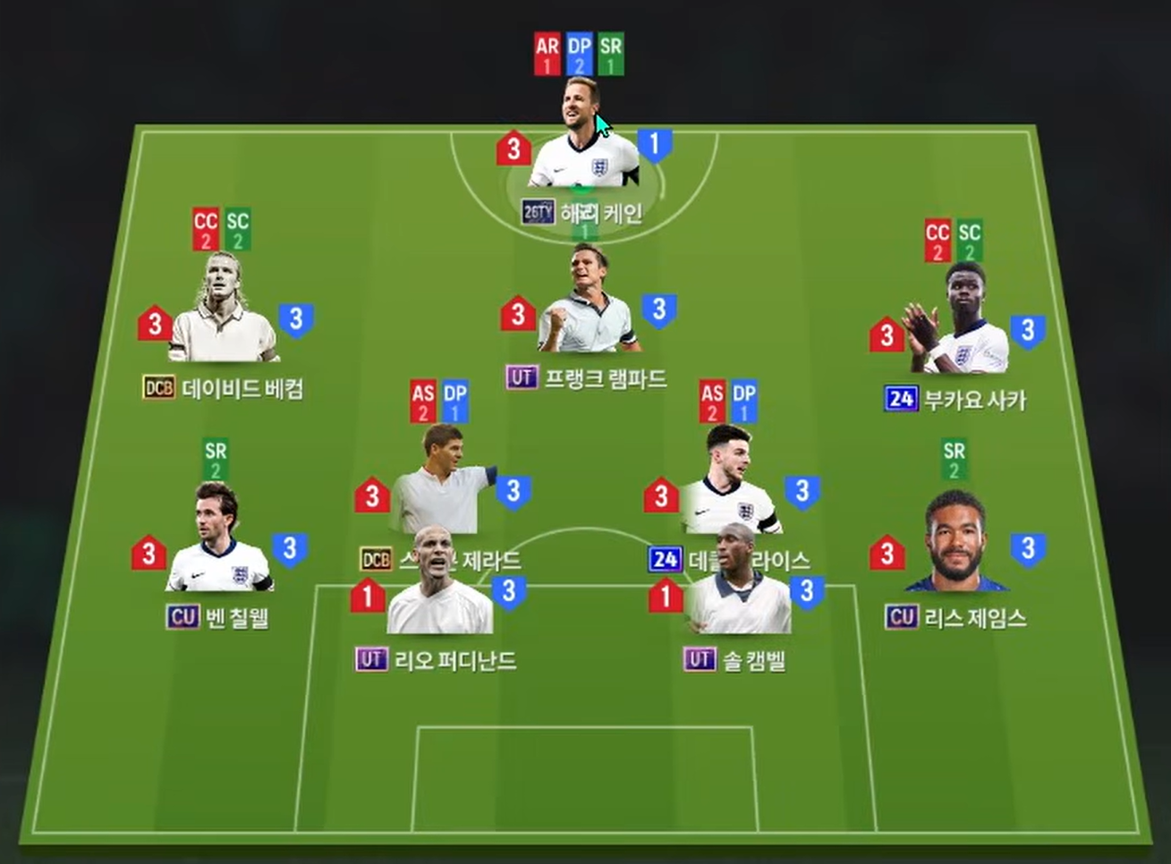 Sơ đồ 42211 được lựa chọn với vị trí tiền đạo cắm là Kane, một trong những trung phong chất lượng hàng đầu game hiện tại. Hỗ trợ phía sau là tiền vệ tấn công Lampard, cựu danh thủ Chelsea có khả năng chuyền bóng và sút xa ấn tượng. Cặp tiền vệ cánh Beckham và Saka sở hữu tốc độ ổn, khả năng chuyền tạt lẫn sút bóng tốt trong các tình huống xâm nhập.