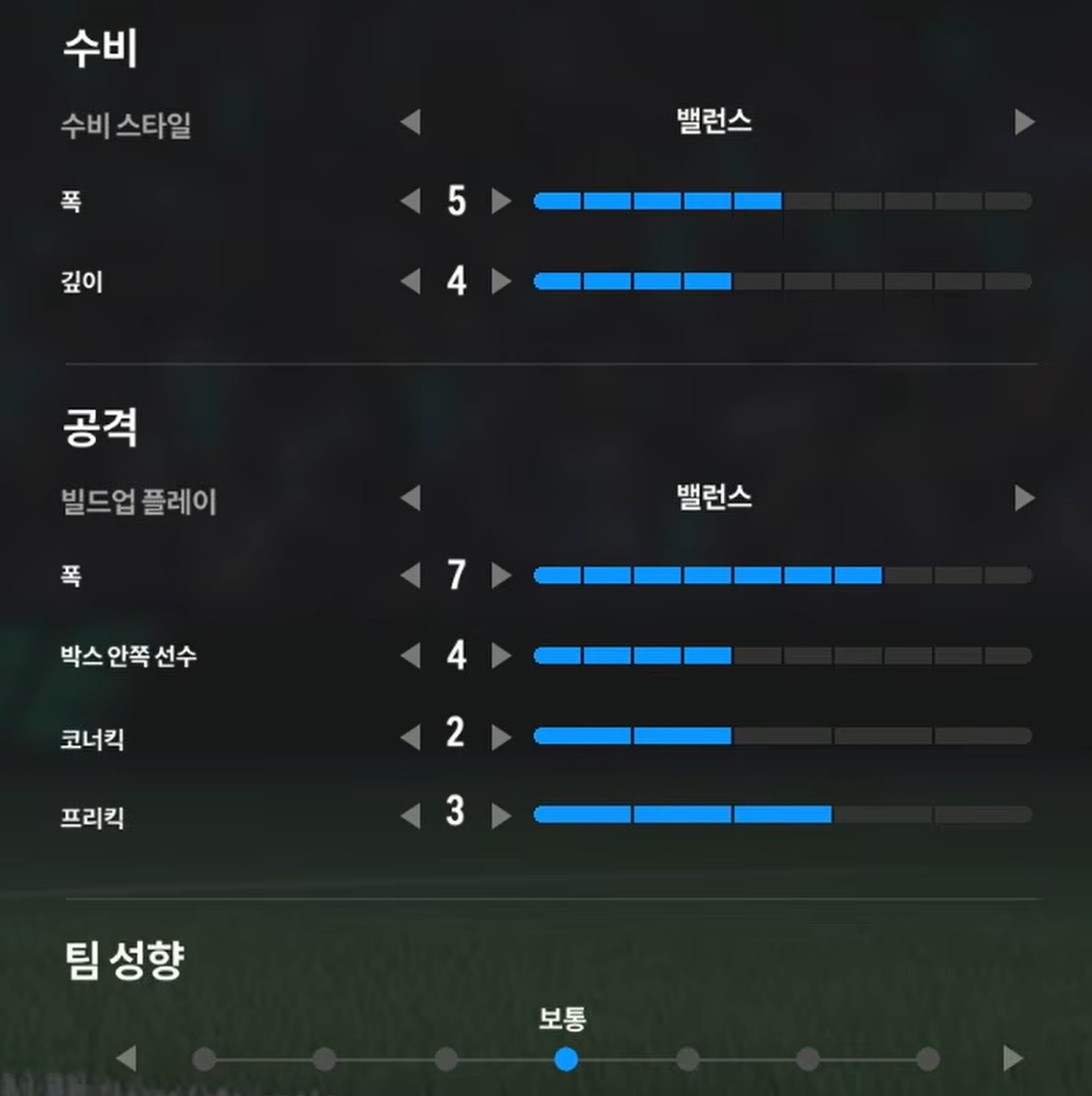 Trong khi, thiết lập tấn công "cân bằng" sẽ phù hợp cho lối chơi kiểm soát bóng, triển khai thế trận chậm, chắc ở tuyến giữa và ban bật với các vệ tinh trên hàng công để mở ra khoảng trống và ghi bàn. Ở lối chơi tấn công này, xu hướng triển khai sẽ là xu hướng chậm, chắc bóng và tìm kiếm cơ hội thay vì tấn công tổng lực và tốc độ cao.