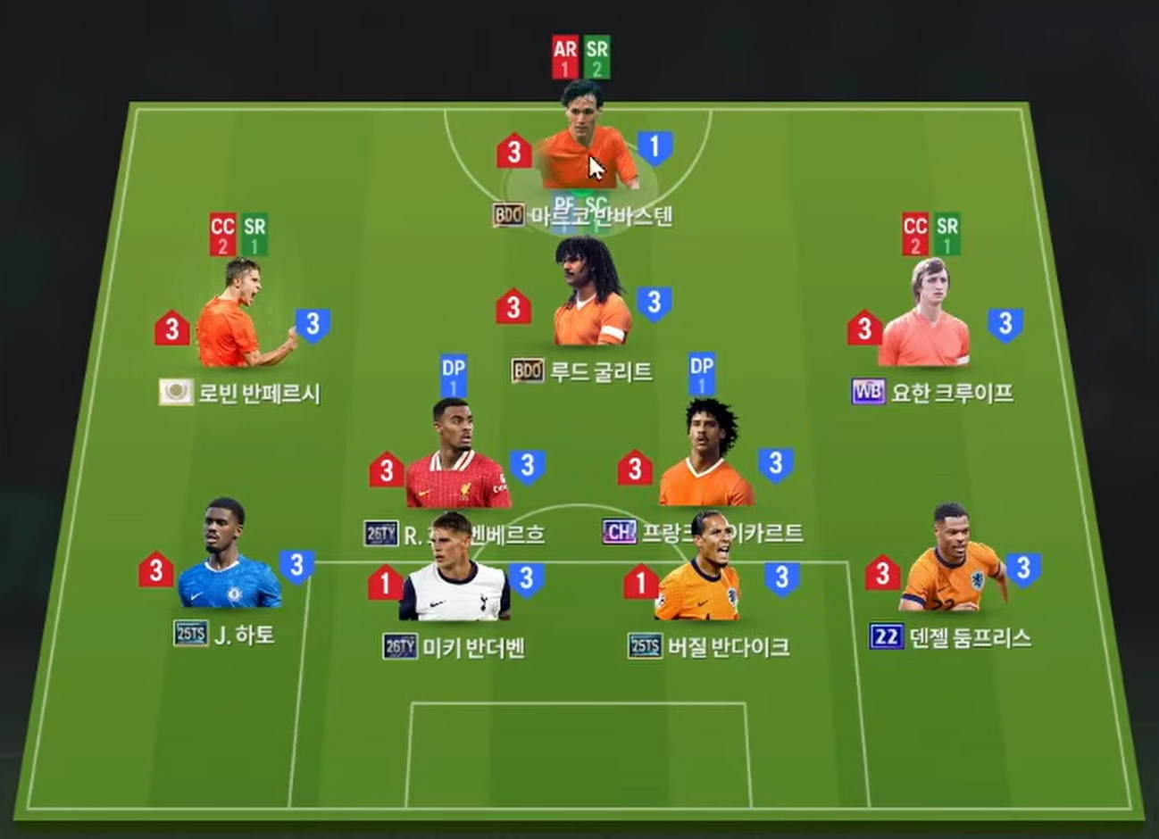 Sơ đồ 42211 được lựa chọn cho team color Hà Lan với vị trí tiền đạo cắm là Van Basten, anh sở hữu khả năng dứt điểm nổi bật bằng cả 2 chân, tốc độ tốt, kỹ năng không chiến cùng AI hiệu quả. Hỗ trợ phía sau là cặp bài trùng ăn ý Gullit, anh là mẫu cầu thủ toàn diện gần như hàng đầu cho vị trí tấn công thời điểm hiện tại.