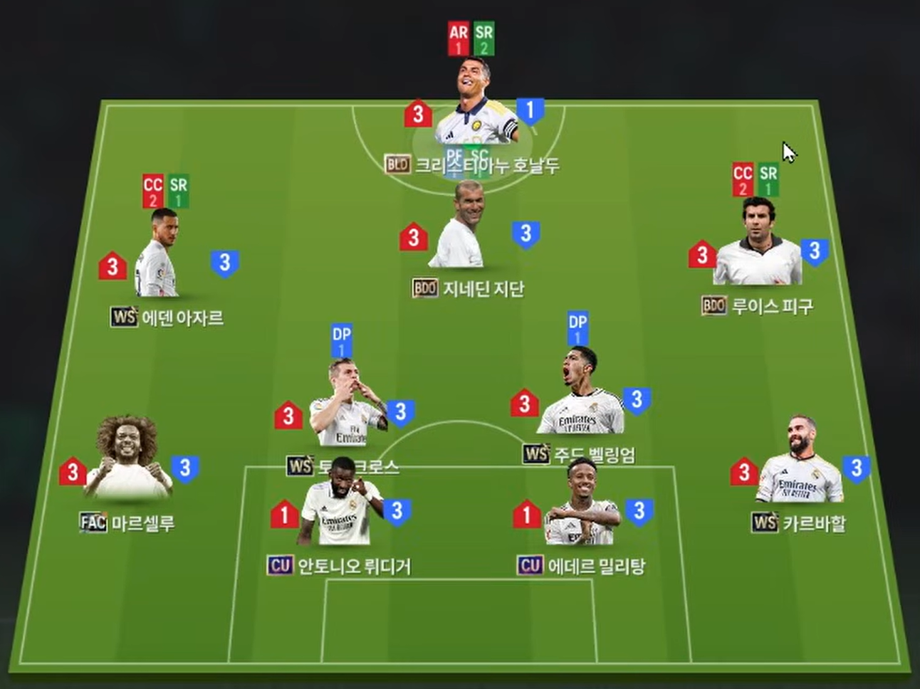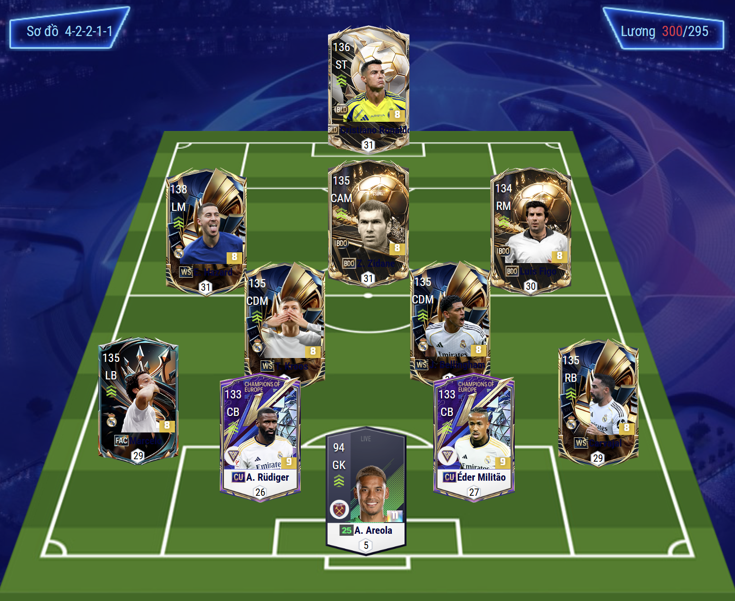 Sơ đồ 42211 được lựa chọn cho team color Real Madrid với vị trí tiền đạo cắm là Cristiano Ronaldo, cầu thủ người Bồ sở hữu khả năng dứt điểm toàn diện, không chiến tốt cùng AI di chuyển nổi bật. Hỗ trợ phía sau là Zidane, cầu thủ người Pháp cũng được xem là mẫu tiền vệ công hàng đầu game hiện tại từ khả năng chuyền bóng, sút xa, cho tới rê dắt cầm nhịp.