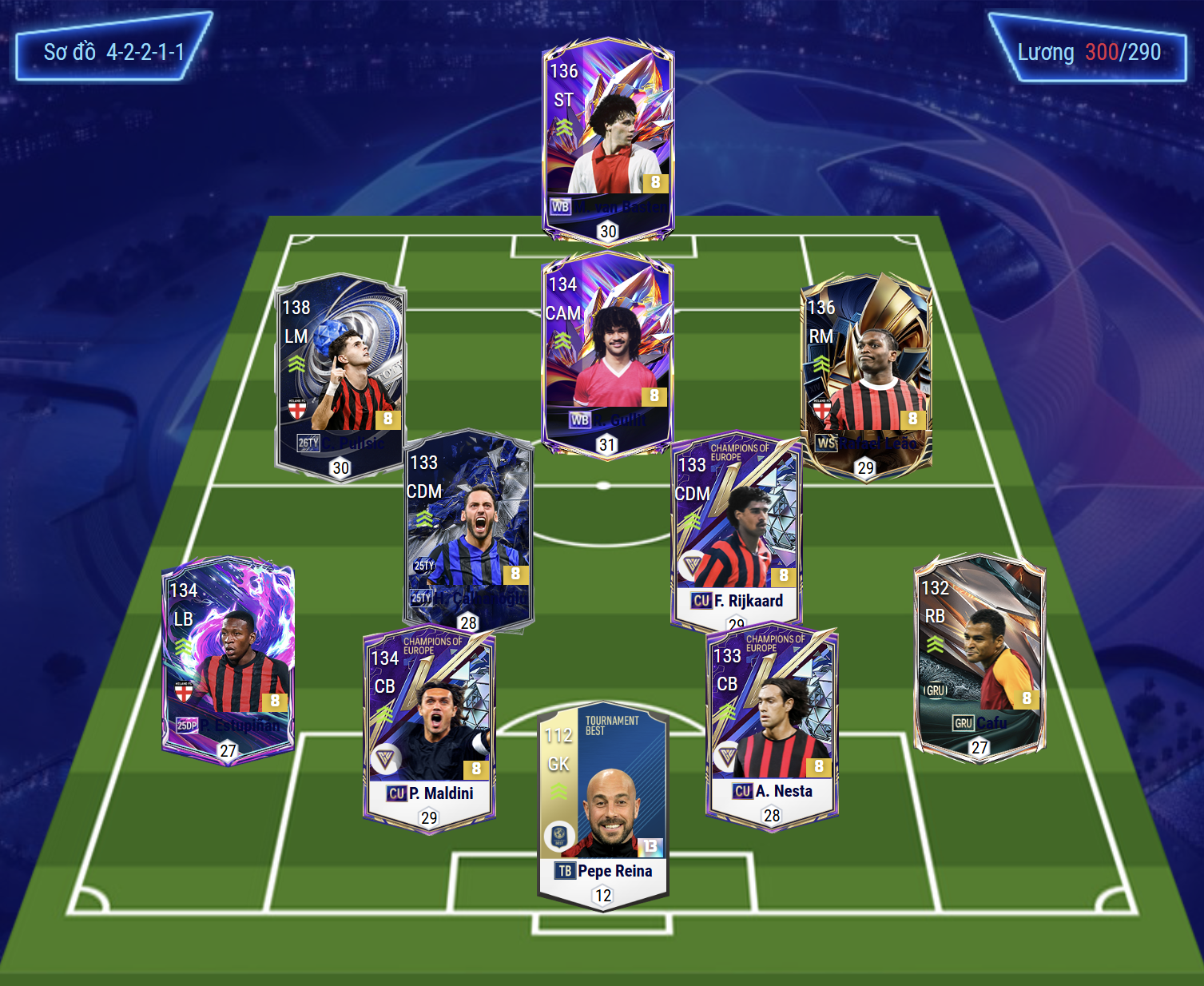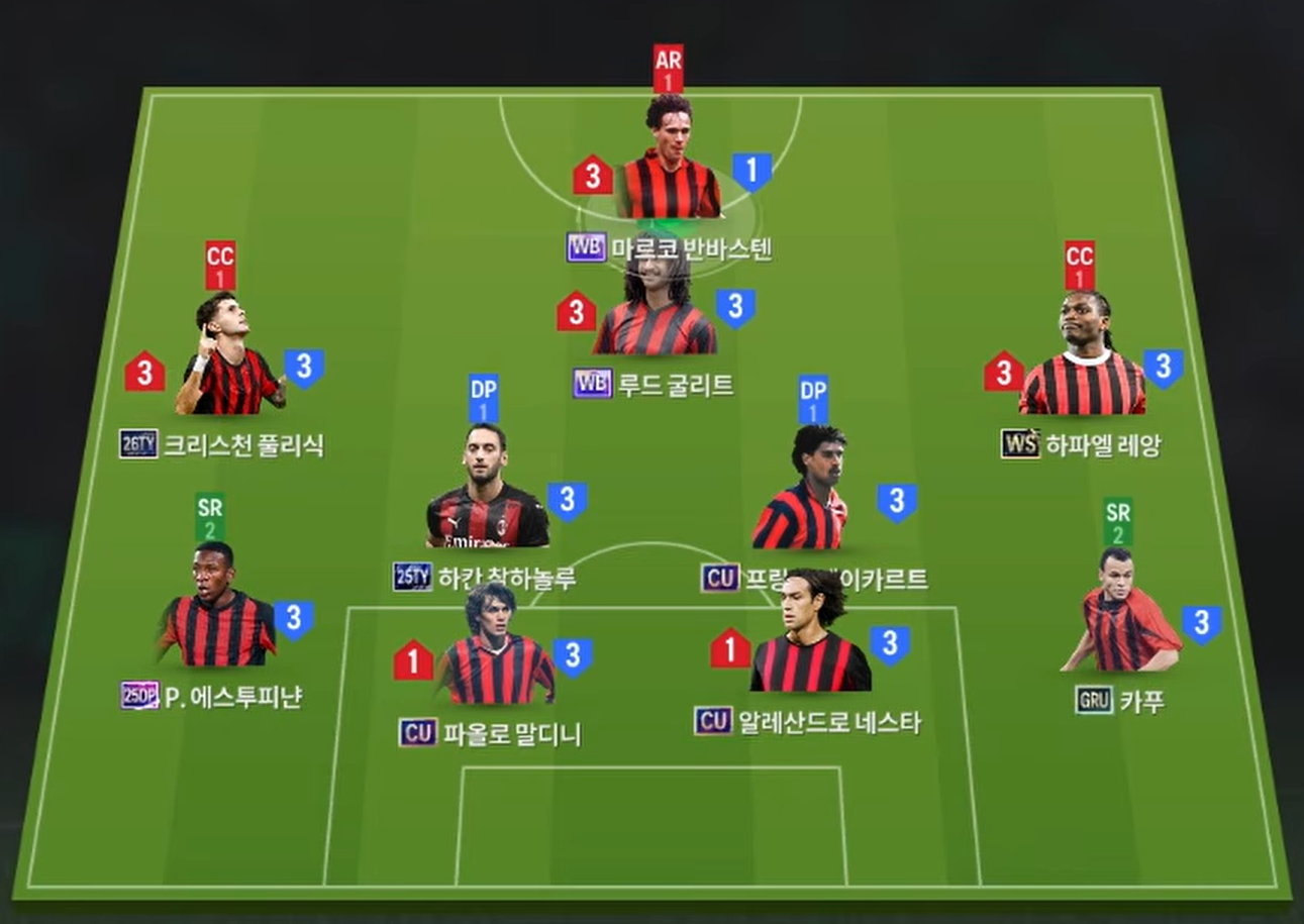 Sơ đồ 42211 được lựa chọn cho team color AC Milan với vị trí tiền đạo cắm là Basten, cầu thủ người Hà Lan là mẫu tiền đạo săn bàn cực kì chất lượng trong phạm vi vòng cấm. Hỗ trợ phía sau là tiền vệ công Gullit, bộ đôi này vừa có thể hình, khả năng không chiến cho tới kỹ năng xử lý bóng, chuyền phối hợp lẫn dứt điểm cực kì sắc bằng cả 2 chân.