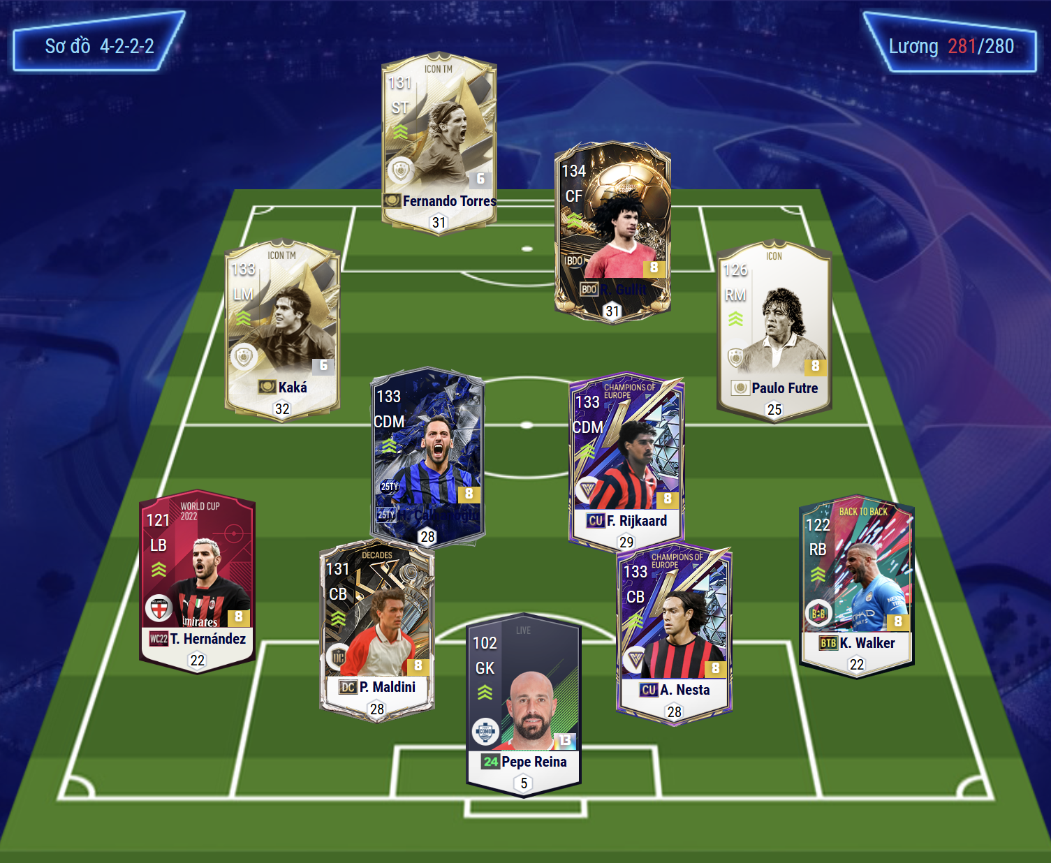 Sơ đồ 4222 được lựa chọn là dạng sơ đồ ST, CF với vị trí tiền đạo cắm ST được lựa chọn là Fernando Torres, đây là mẫu tiền đạo được tin dùng ở AI di chuyển và khả năng dứt điểm sắc bén. Phía sau Torres là Gullit, cầu thủ người Hà Lan khá toàn diện ở khả năng chuyền bóng, dứt điểm không chiến cho đến tì đè.