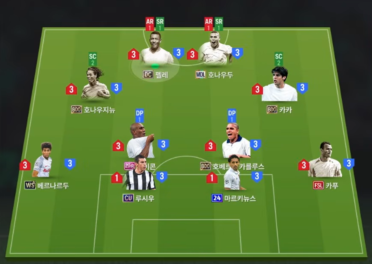 Sơ đồ 4222 được lựa chọn cho team color Brazil với vị trí tiền đạo cắm là cặp đôi Pele và Ronaldo de Lima, cả 2 sở hữu tốc độ, khả năng dứt điểm toàn diện bằng cả 2 chân cùng với kỹ năng rê dắt xử lý bóng cực kì dẻo. AI di chuyển thông minh cũng giúp tạo ra nhiều cơ hội dâng cao tấn công hơn trong các tình huống phối hợp.