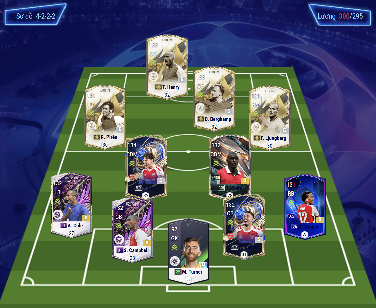 Sơ đồ 4222 được lựa chọn với vị trí tiền đạo cắm là Henry, một trong những trung phong có tốc độ hàng đầu game, khả năng dứt điểm tốt bằng cả 2 chân cùng AI di chuyển khôn bóng. Hỗ trợ phía sau là Bergkamp, hộ công người Hà Lan cũng là mẫu tiền đạo sút tốt bằng 2 chân, khả năng chuyền bóng kiến tạo ổn cùng 1 AI di chuyển đâng cao tham gia ghi bàn cực kì tích cực.